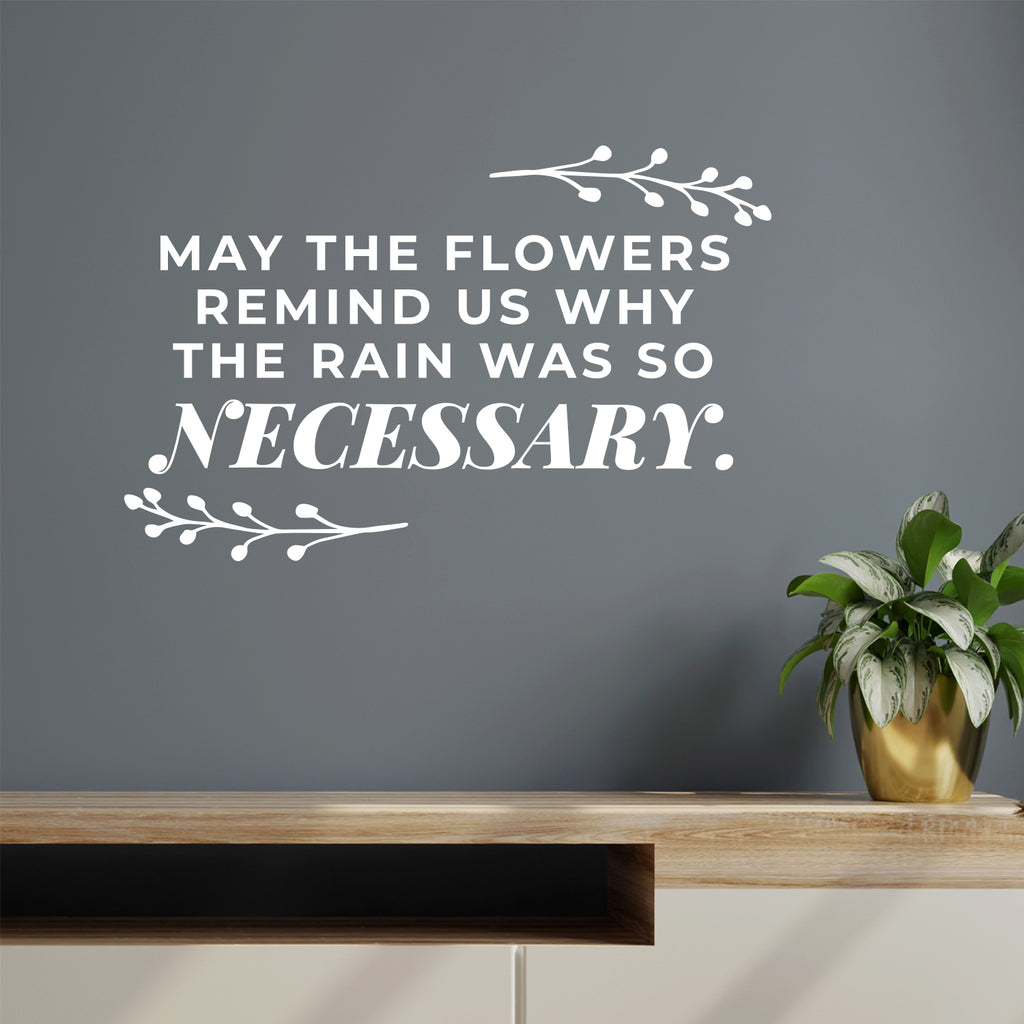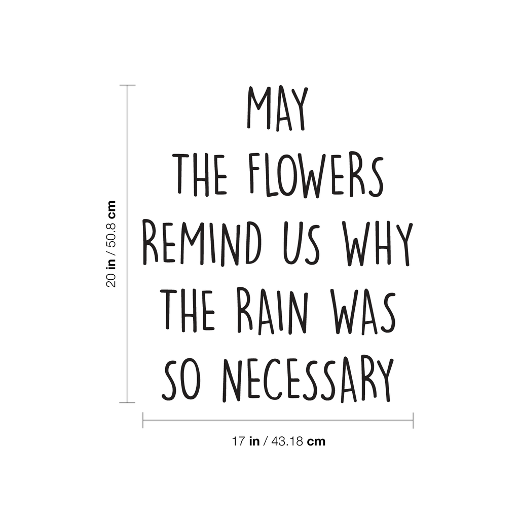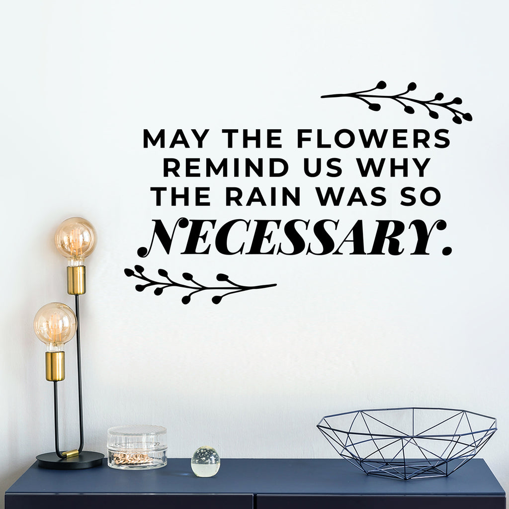 This lovely decal quote "May The Flowers Remind Us Why The Rain Was So Necessary"; is the perfect touch for your office. Use it for your bedroom; closet; living room or anywhere you want to bring some extra positive decoration. It's a vinyl sticker that is easy to put on any smooth and dry surface. Our modern designs don't just brighten up the room; but brighten up the day. Using top of the line vinyl across all of our production allows us to be the leaders in quality and design.