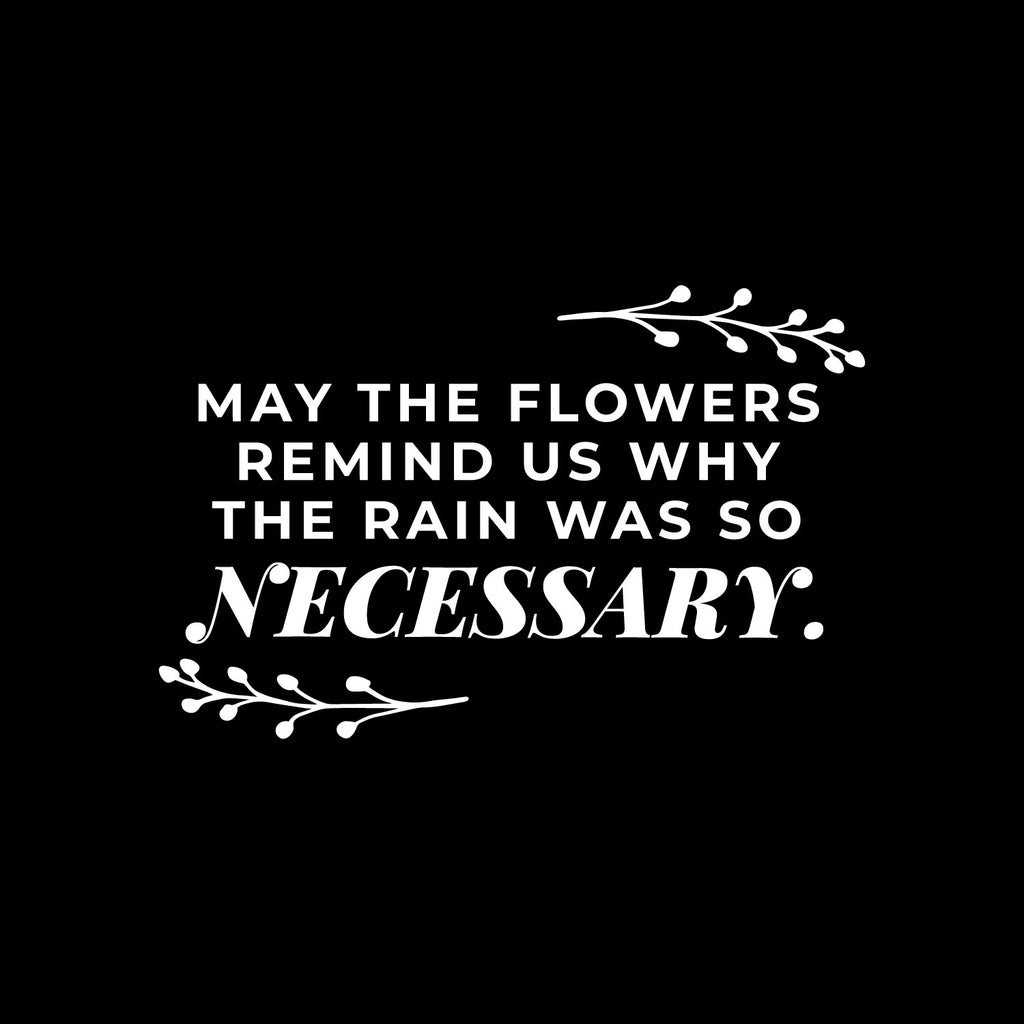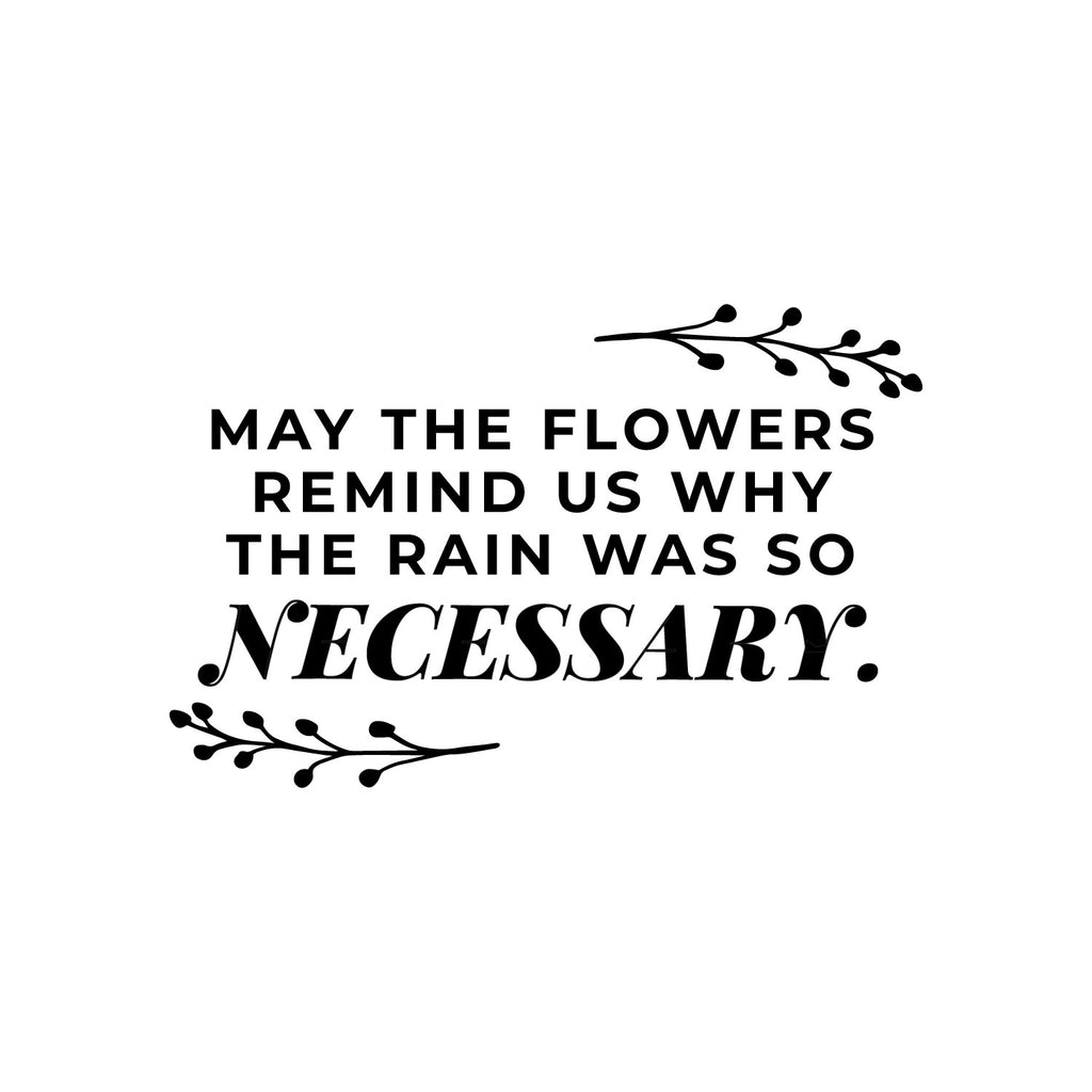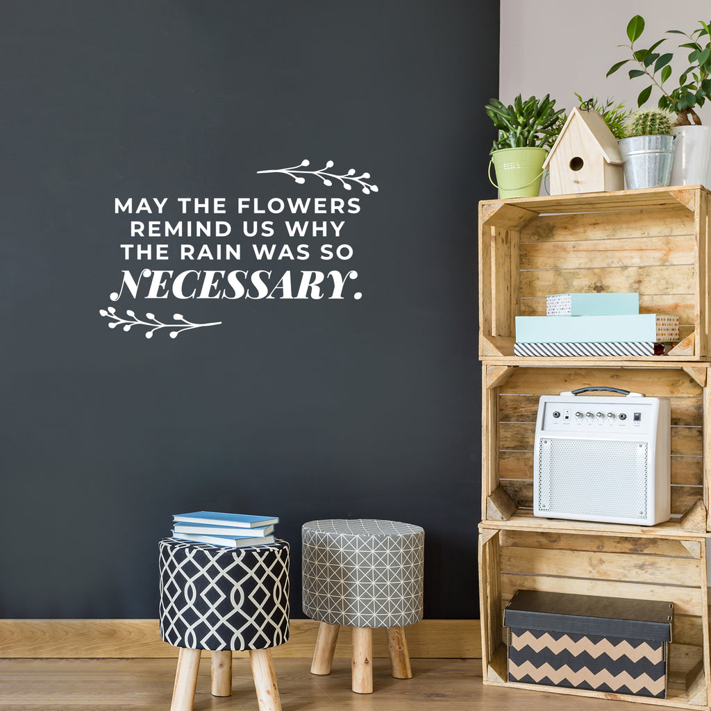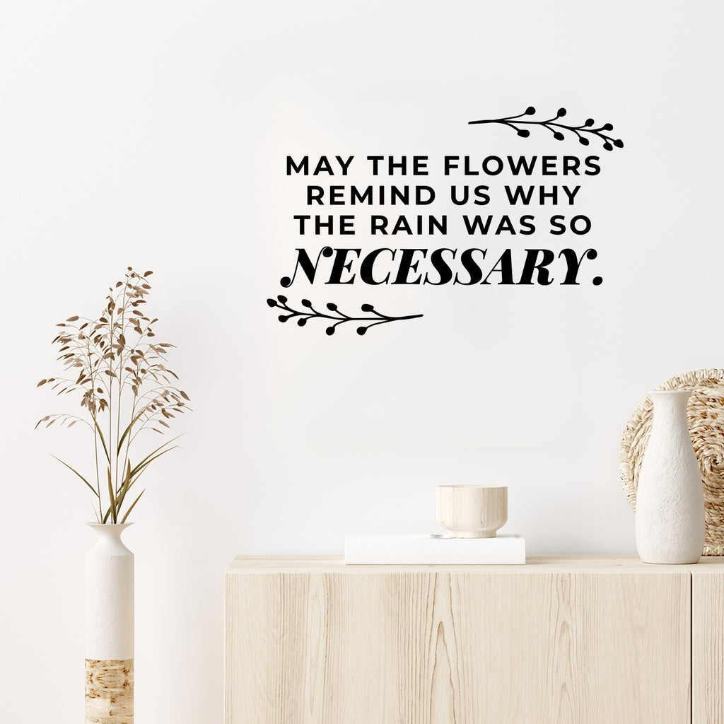 This lovely decal quote "May The Flowers Remind Us Why The Rain Was So Necessary"; is the perfect touch for your office. Use it for your bedroom; closet; living room or anywhere you want to bring some extra positive decoration. It's a vinyl sticker that is easy to put on any smooth and dry surface. Our modern designs don't just brighten up the room; but brighten up the day. Using top of the line vinyl across all of our production allows us to be the leaders in quality and design.