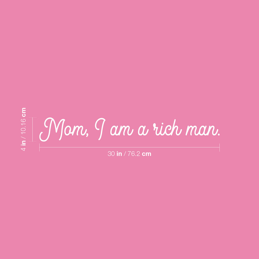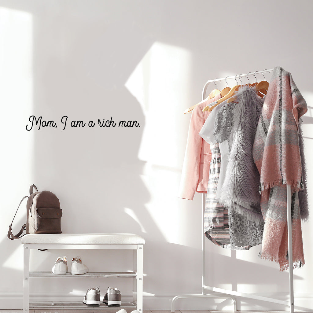 This awesome cute & inspiring decal quote "Mom; I Am A Rich Man"; is the perfect touch for your home. Use it for your living room; playroom; kids room or anywhere you want to bring some extra cute decoration. It's a vinyl sticker that is easy to put on any smooth and dry surface. Our modern designs don't just brighten up the room; but brighten up the day. Using top of the line vinyl across all of our production allows us to be the leaders in quality and design.