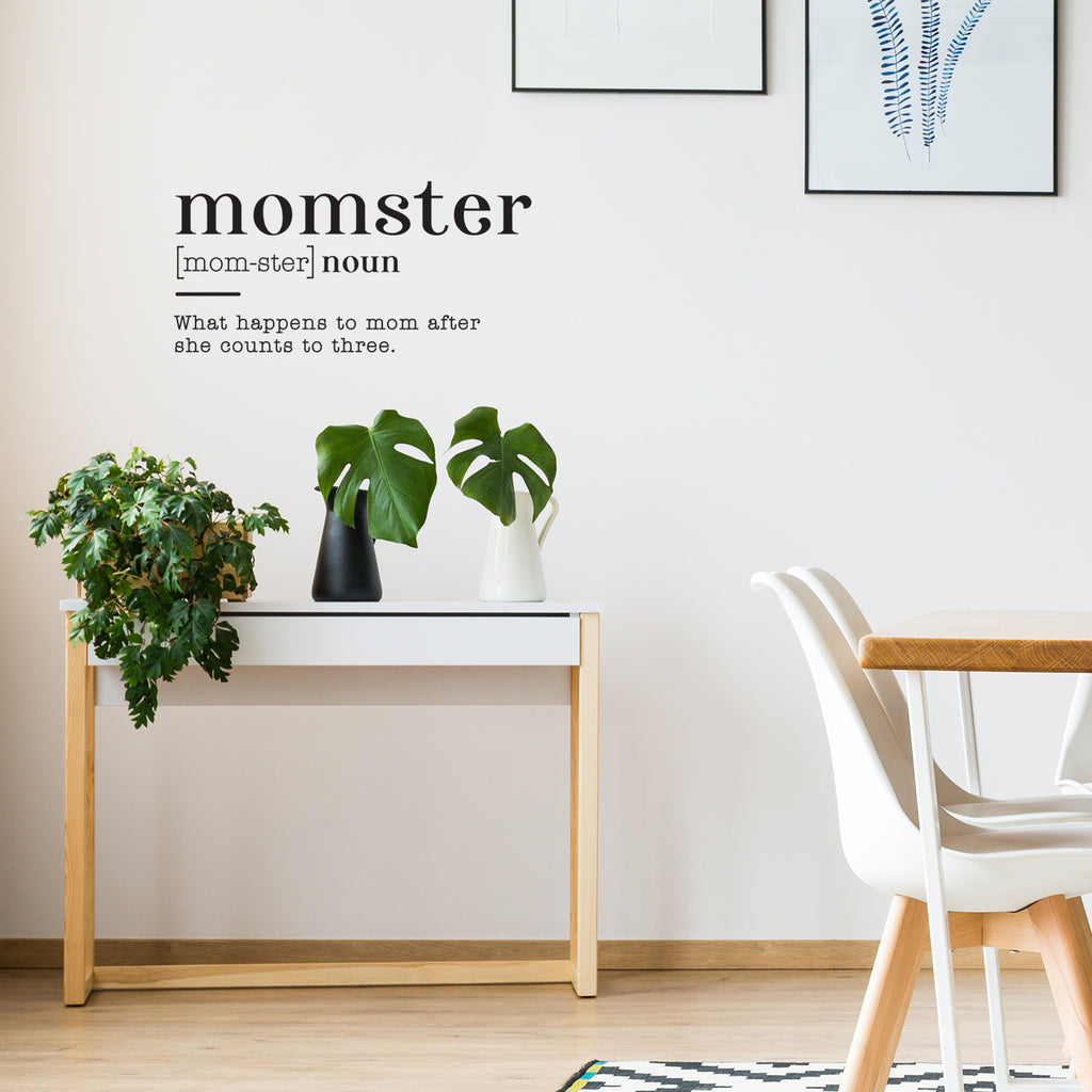 This funny wall art decal "Momster Noun What Happens To Mom After She Counts To Three" is witty and the perfect touch for both indoor and outdoor decoration. It is a vinyl sticker that is easy to put onto almost any smooth surface and really brings a room together adding the perfect amount of decoration. This vinyl decal sticker is great to put anywhere in your home just as a funny reminder that mom is always the boss. Our modern quotes don't just brighten up the room but brighten up the day. Using the top of the line vinyl across all of our production allows us to be the leaders in quality and design. Each vinyl decal quotes range in color bringing variety to you wherever you are.
