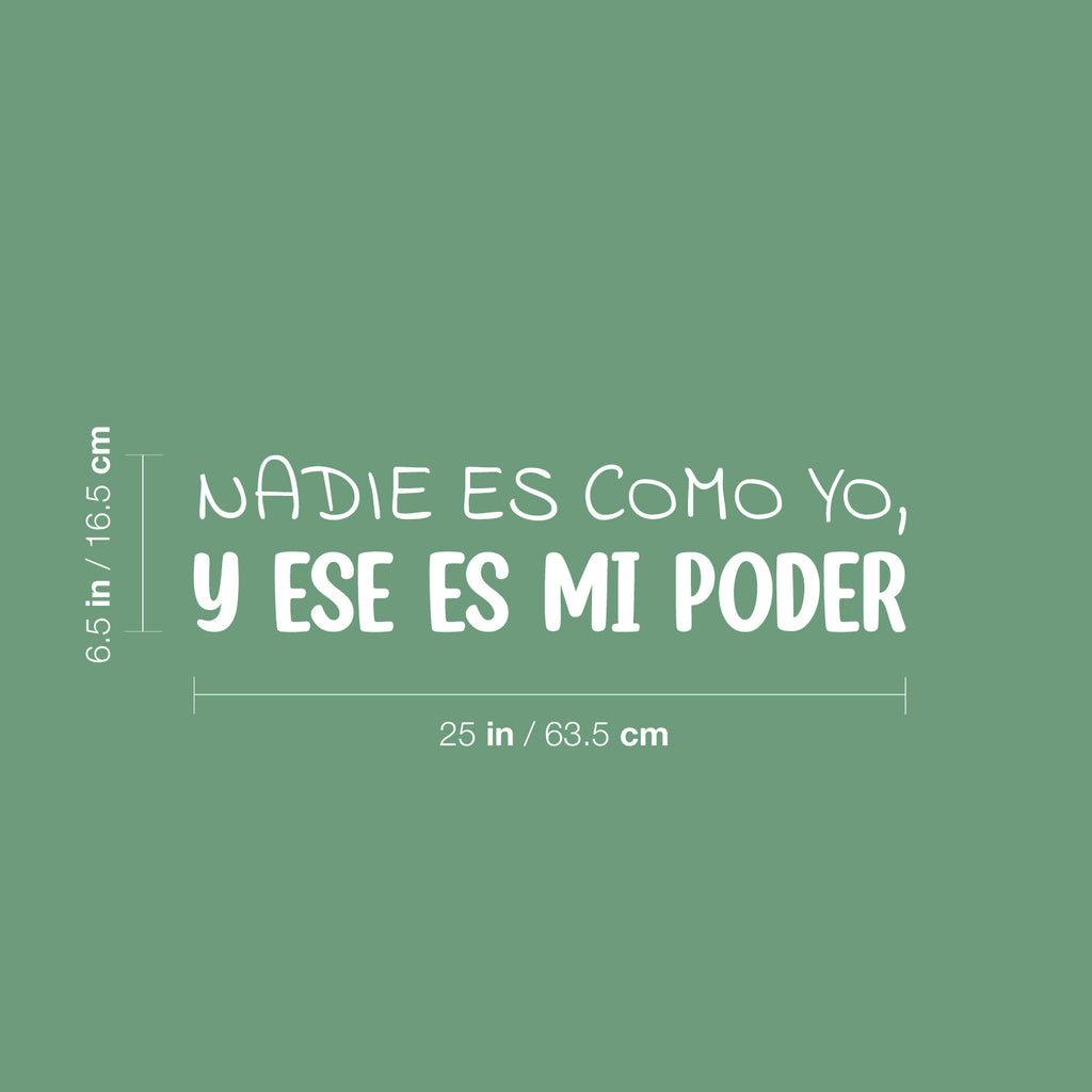 This awesome motivational decal quote "Nadie Es Como Yo; Y Ese Es Mi Poder / Nobody Is Like Me; And That's My Power"; is the perfect touch for your home or office. Use it for your living room; office; school or anywhere you want to bring some extra positive decoration. It's a vinyl sticker that is easy to put on any smooth and dry surface. Our modern designs don't just brighten up the room; but brighten up the day. Using top of the line vinyl across all of our production allows us to be the leaders in quality and design.