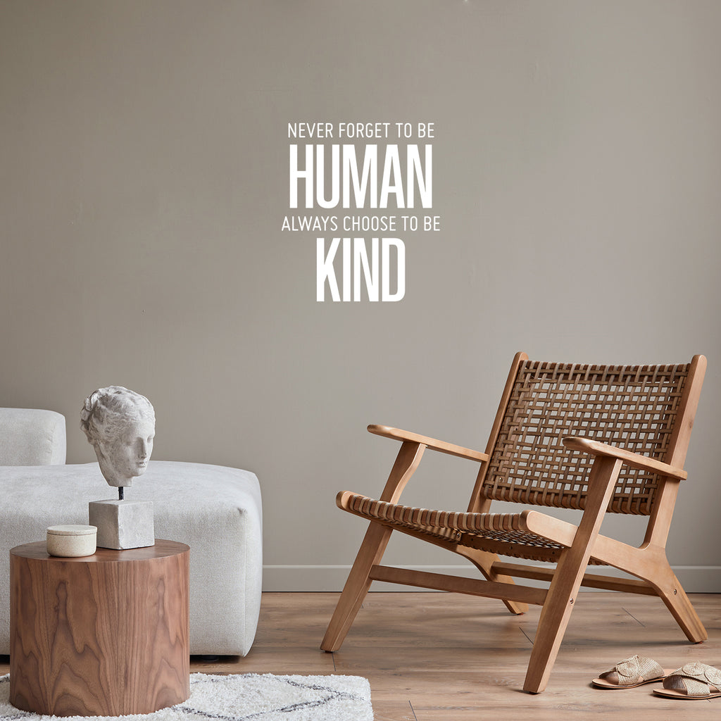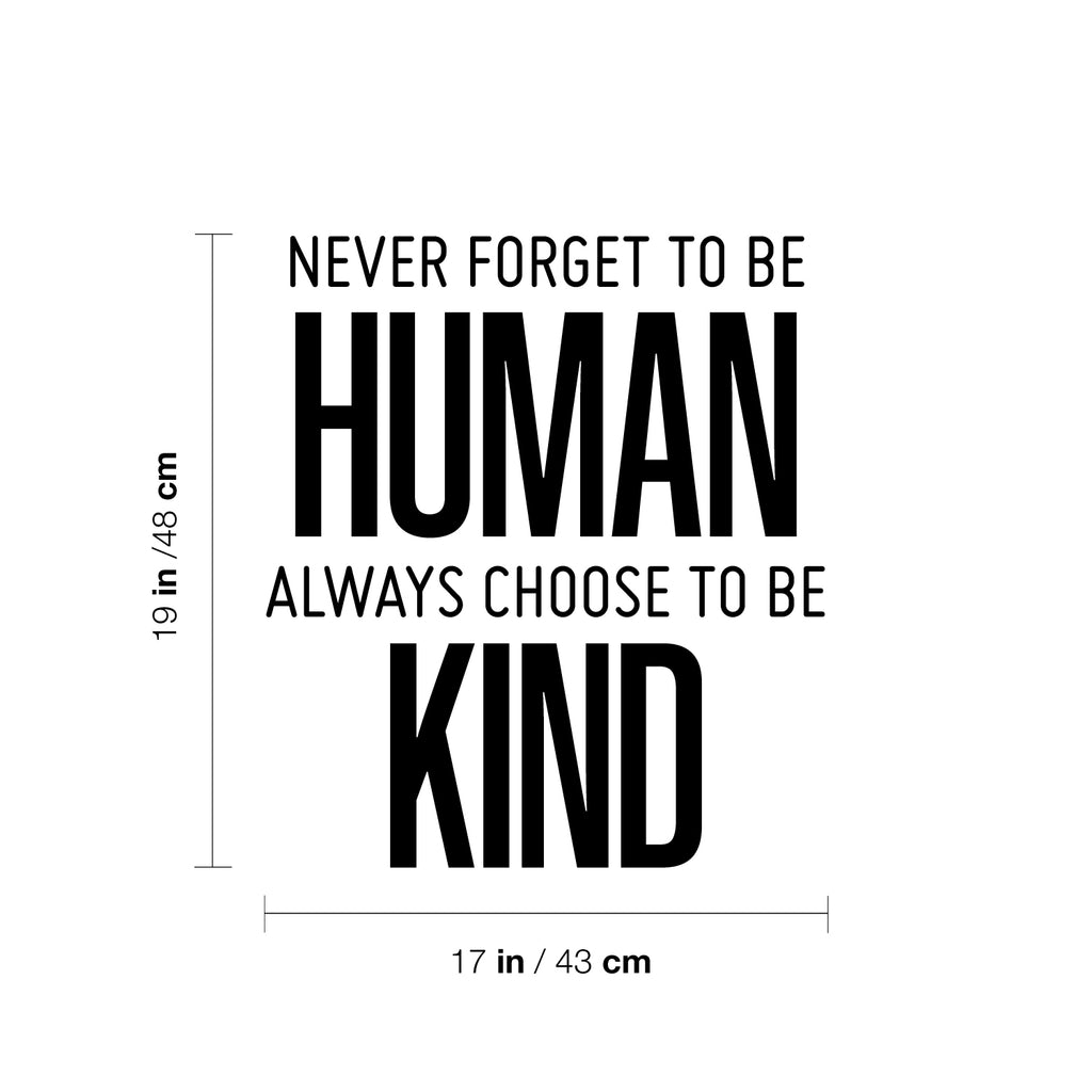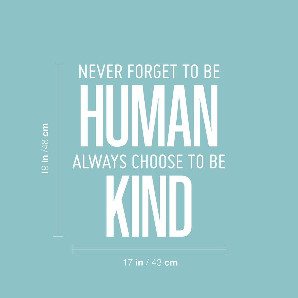 This decal quote "Never Forget To Be Human Always Choose To Be Kind" is the perfect touch for your home. Use it for your bedroom or anywhere you want to bring some extra cute decoration. It's a vinyl sticker that is easy to put on any smooth and dry surface. Our modern designs don't just brighten up the room; but brighten up the day. Using top of the line vinyl across all of our production allows us to be the leaders in quality and design.