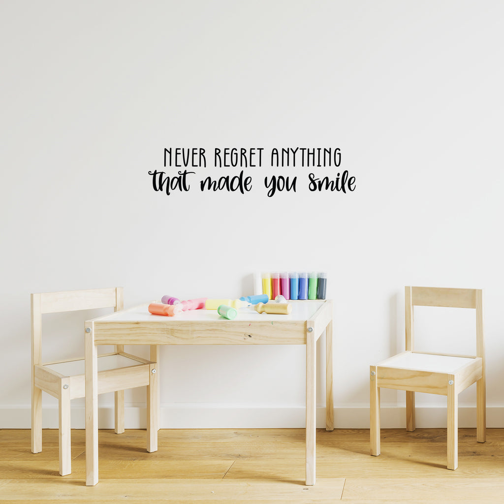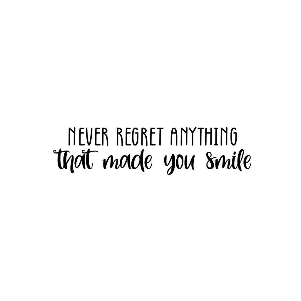 This awesome inspiring decal quote "Never Regret Anything That Made You Smile"; is the perfect touch for your office or home. Use it for your kids room; play room; storefront or anywhere you want to bring some extra positive decoration. It's a vinyl sticker that is easy to put on any smooth and dry surface. Our modern designs don't just brighten up the room; but brighten up the day. Using top of the line vinyl across all of our production allows us to be the leaders in quality and design.