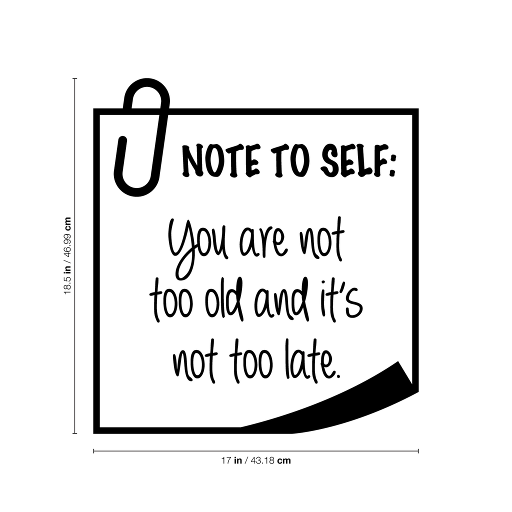 This awesome positive decal quote "Note To Self You Are Not Too Old And It's Not Too Late"; is the perfect touch for your home or work. Use it for your dorm room; living room or anywhere you want to bring some extra optimistic decoration. It's a vinyl sticker that is easy to put on any smooth and dry surface. Our modern designs don't just brighten up the room; but brighten up the day. Using top of the line vinyl across all of our production allows us to be the leaders in quality and design.