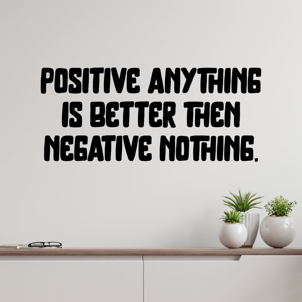 This positive decal quote "Positive Anything Is Better Than Negative Nothing"; is the perfect touch for your home or office. Use it for your bedroom; closet; living room or anywhere you want to bring some extra optimistic decoration. It's a vinyl sticker that is easy to put on any smooth and dry surface. Our modern designs don't just brighten up the room; but brighten up the day. Using top of the line vinyl across all of our production allows us to be the leaders in quality and design.