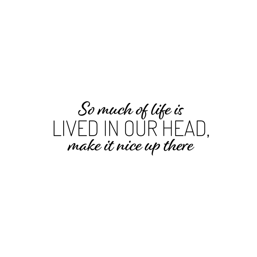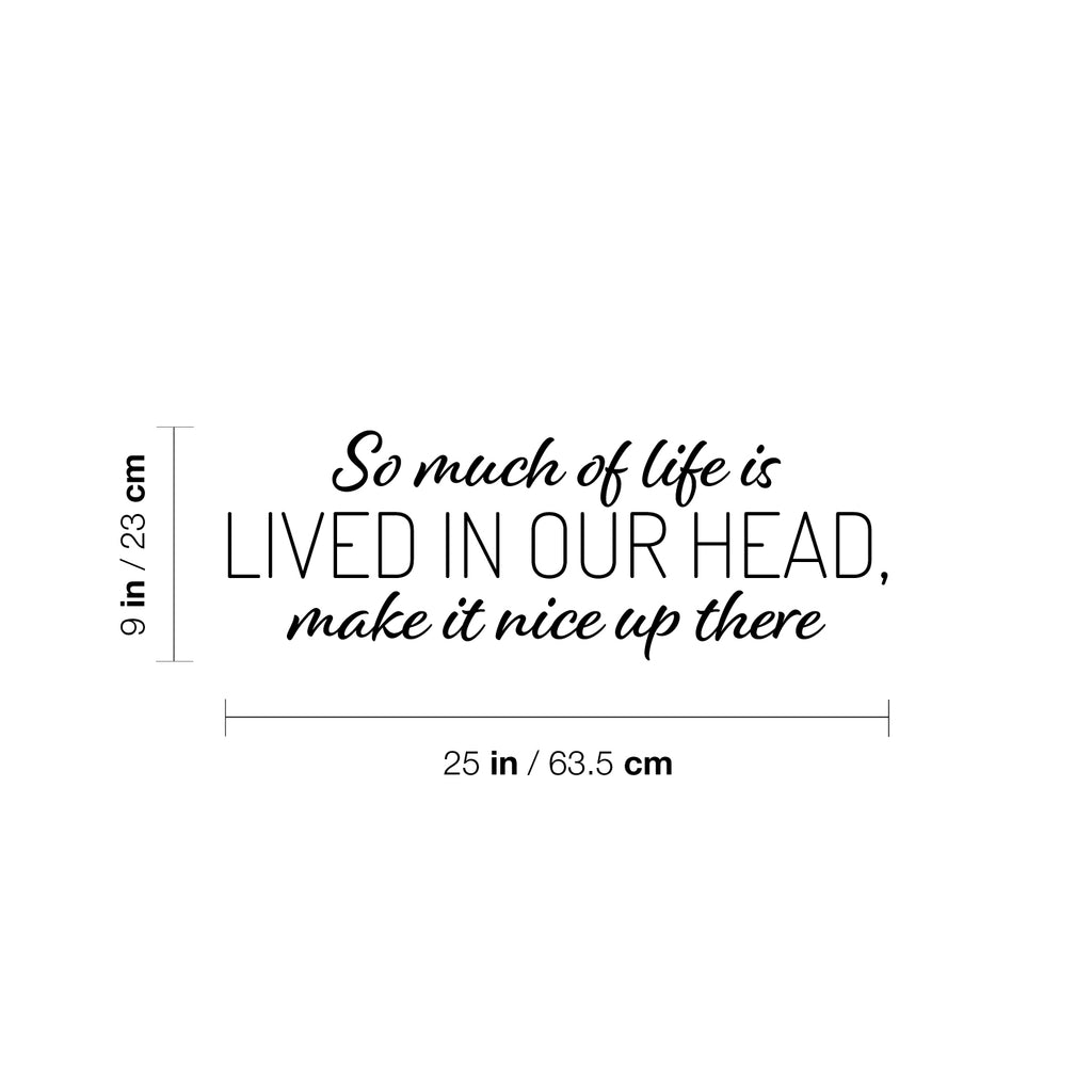 This awesome inspirational decal quote "So Much Of Life Is Lived In Our Head Make It Nice Up There"; is the perfect touch for your home. Use it for your bedroom; living room; closet or anywhere you want to bring some extra positive decoration. It's a vinyl sticker that is easy to put on any smooth and dry surface. Our modern designs don't just brighten up the room; but brighten up the day. Using top of the line vinyl across all of our production allows us to be the leaders in quality and design.