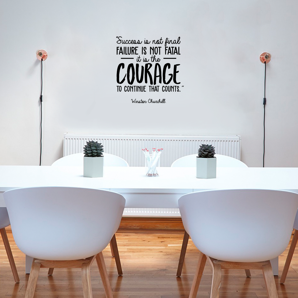 This "Success Is Not Final Failure Is Not Fatal It Is The Courage To Continue That Counts - Winston Churchill" decal is the perfect touch for your home or office. Use it for your bedroom; living room; work; or anywhere you want to bring some extra decoration. It's a vinyl sticker that is easy to put on any smooth and dry surface. Our modern designs don't just brighten up the room; but brighten up the day. Using top of the line vinyl across all of our production allows us to be the leaders in quality and design.