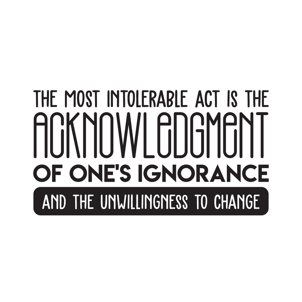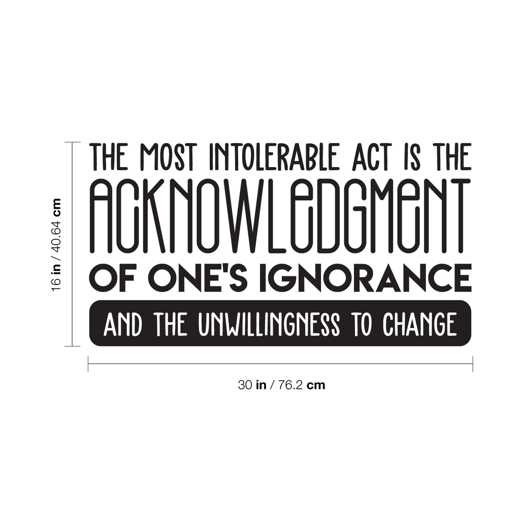 This awesome positive decal quote "The Most Intolerable Act Is The Acknowledgment Of One's Ignorance And The Unwillingness To Change"; is the perfect touch for your home or office. Use it for your bedroom; kids room; living room or anywhere you want to bring some extra optimistic decoration. It's a vinyl sticker that is easy to put on any smooth and dry surface. Our modern designs don't just brighten up the room; but brighten up the day. Using top of the line vinyl across all of our production allows us to be the leaders in quality and design.