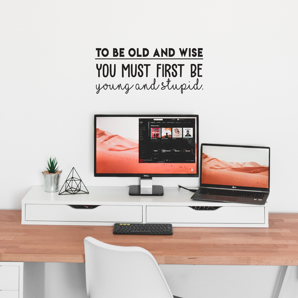 This awesome optimistic decal quote "To Be Old And Wise You Must First Be Young And Stupid"; is the perfect touch for your home or office. Use it for your bedroom; closet; living room or anywhere you want to bring some extra positive decoration. It's a vinyl sticker that is easy to put on any smooth and dry surface. Our modern designs don't just brighten up the room; but brighten up the day. Using top of the line vinyl across all of our production allows us to be the leaders in quality and design.
