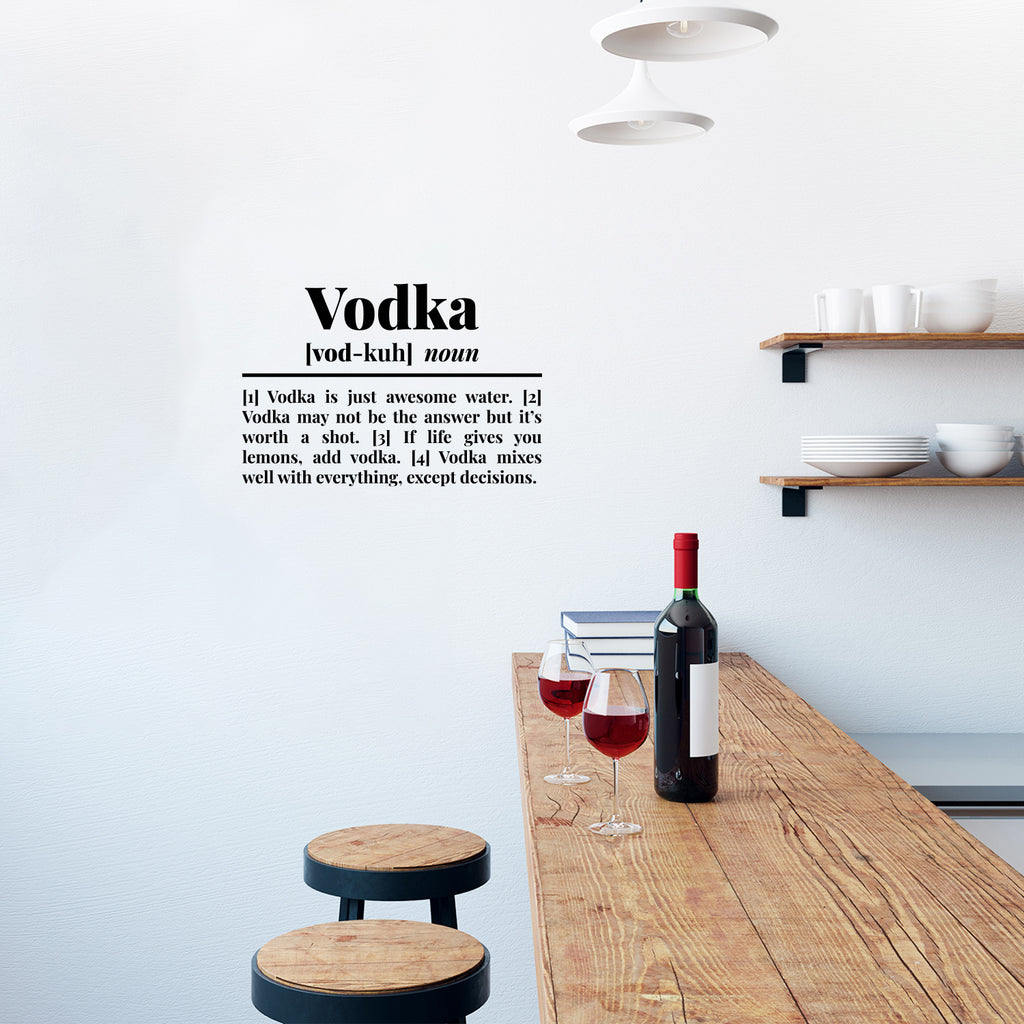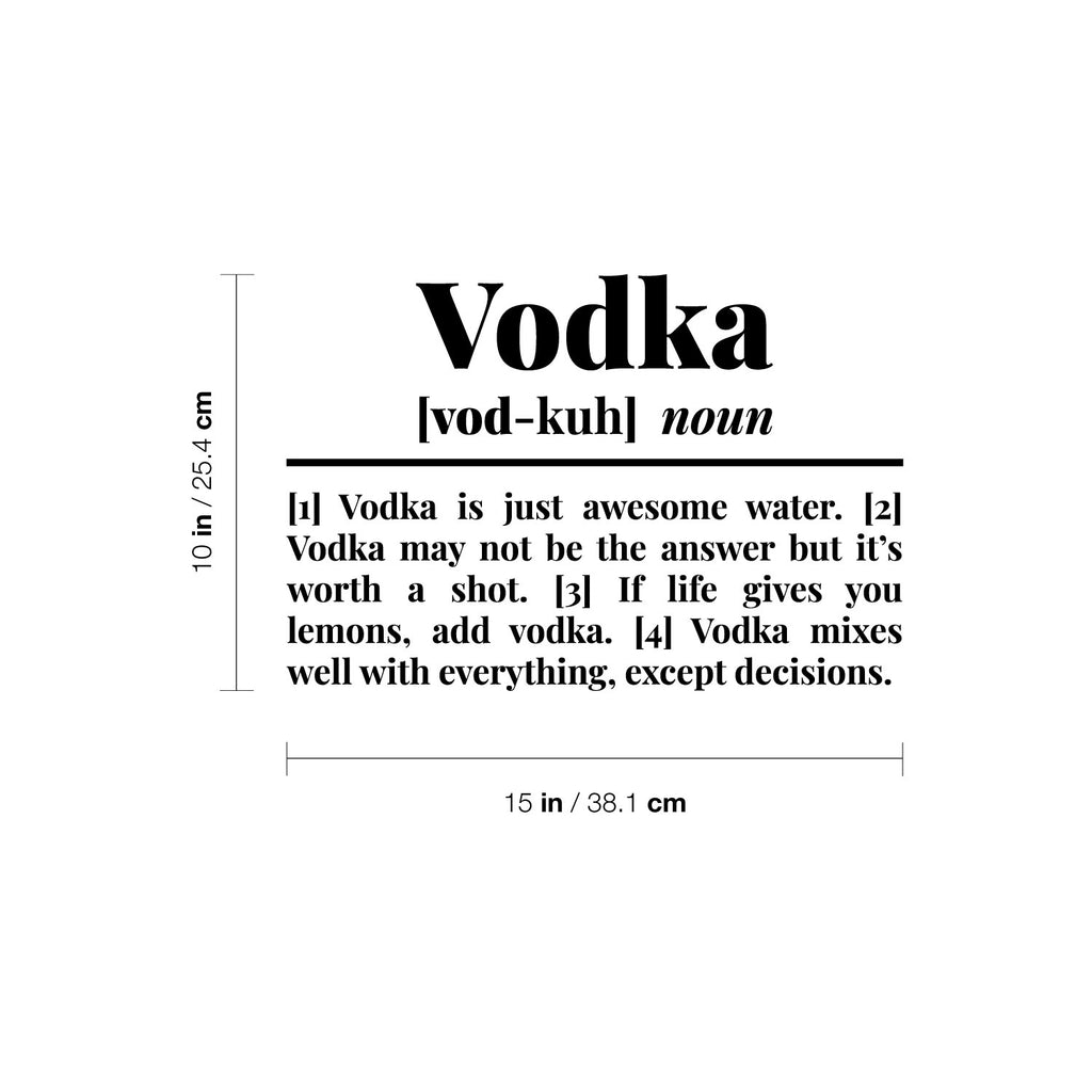 This funny decal quote "Vodka Definition"; is the perfect touch for your home. Use it for your living room; kitchen; dining room or anywhere you want to bring some extra cute decoration. It's a vinyl sticker that is easy to put on any smooth and dry surface. Our modern designs don't just brighten up the room; but brighten up the day. Using top of the line vinyl across all of our production allows us to be the leaders in quality and design.