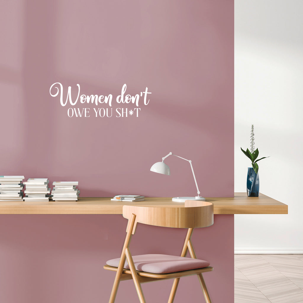 This awesome decal quote "Women Don't Owe You Sh!t"; is the perfect touch for your home or apartment. Use it for your dorm room; home office or anywhere you want to bring some extra decoration. It's a vinyl sticker that is easy to put on any smooth and dry surface. Our modern designs don't just brighten up the room; but brighten up the day. Using top of the line vinyl across all of our production allows us to be the leaders in quality and design.