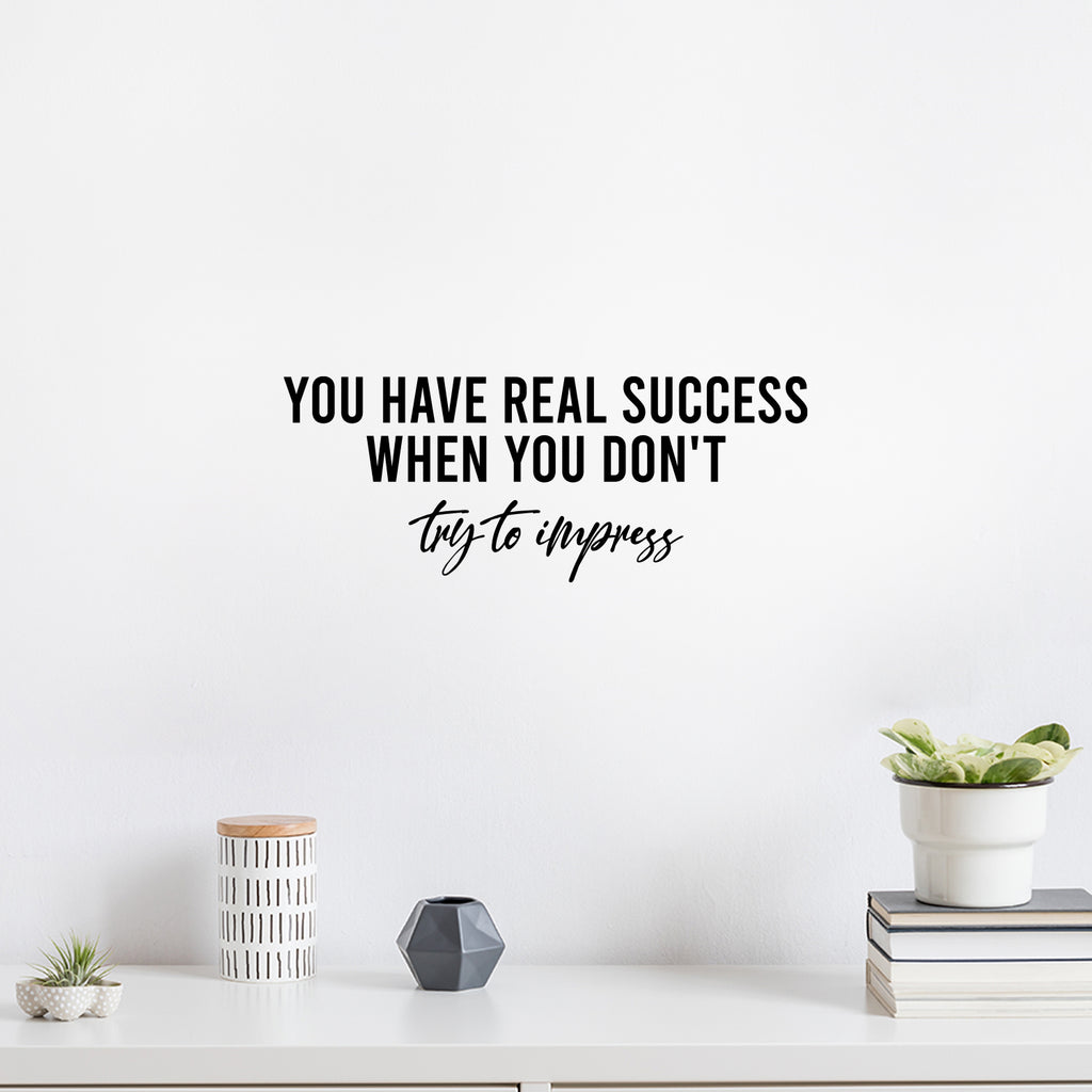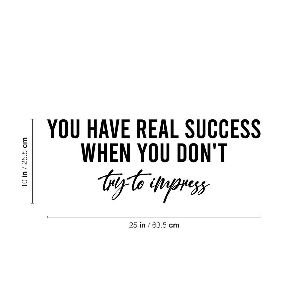 This awesome positive decal quote "You Have Real Success When You Don't Try To Impress"; is the perfect touch for your home. Use it for your office; fitness center; storefront or anywhere you want to bring some extra positive decoration. It's a vinyl sticker that is easy to put on any smooth and dry surface. Our modern designs don't just brighten up the room; but brighten up the day. Using top of the line vinyl across all of our production allows us to be the leaders in quality and design.