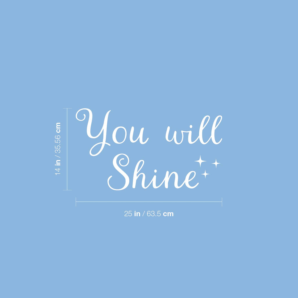 This awesome cute & fun decal quote "You Will Shine"; is the perfect touch for your school or office. Use it for your make up mirror; bathroom; business or anywhere you want to bring some extra positive decoration. It's a vinyl sticker that is easy to put on any smooth and dry surface. Our modern designs don't just brighten up the room; but brighten up the day. Using top of the line vinyl across all of our production allows us to be the leaders in quality and design.