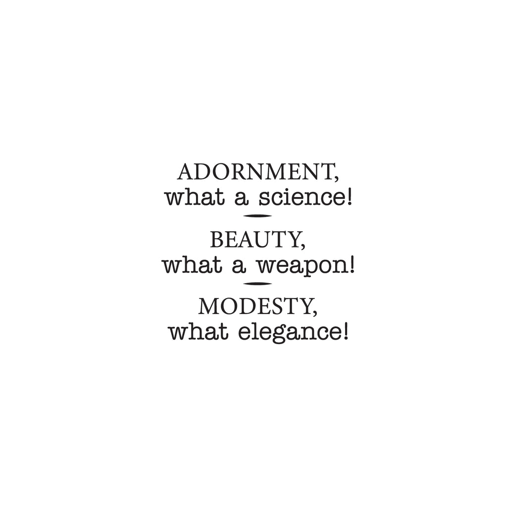 This awesome girly decal quote "Adornment What A Science Beauty What A Weapon Modesty What Elegance"; is the perfect touch for your home or store. Use it for your bedroom; living room or anywhere you want to bring some extra cute decoration. It's a vinyl sticker that is easy to put on any smooth and dry surface. Our modern designs don't just brighten up the room; but brighten up the day. Using top of the line vinyl across all of our production allows us to be the leaders in quality and design.