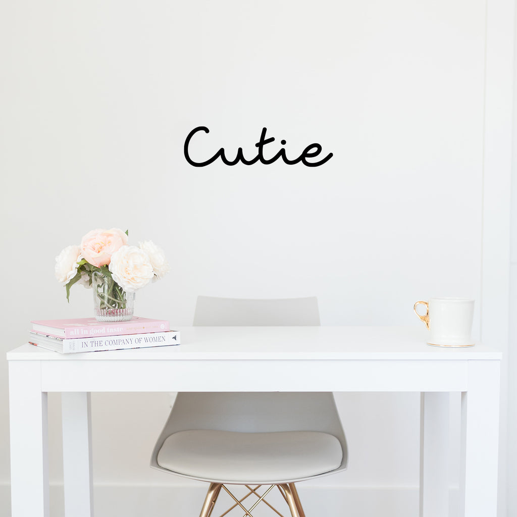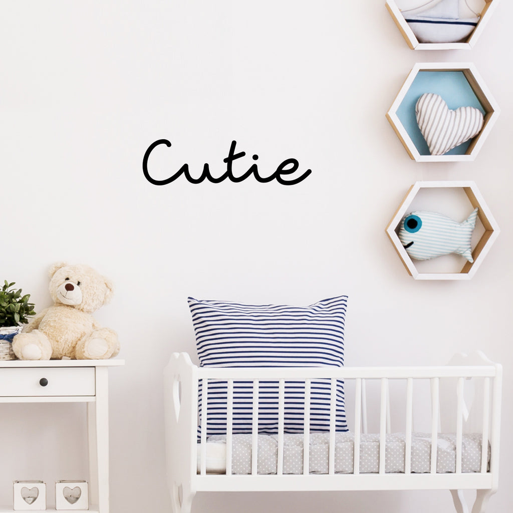 This awesome cute decal quote "Cutie"; is the perfect touch for your home. Use it for your living room; playroom; kids room or anywhere you want to bring some extra cute decoration. It's a vinyl sticker that is easy to put on any smooth and dry surface. Our modern designs don't just brighten up the room; but brighten up the day. Using top of the line vinyl across all of our production allows us to be the leaders in quality and design.