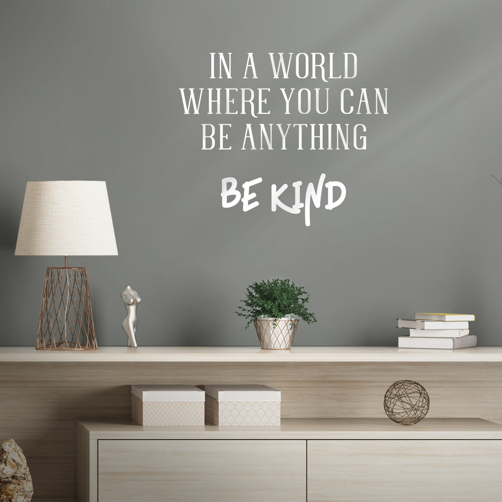 This motivating "In A World Where You Can Be Anything Be Kind" life quotes wall art decal is inspiring and the perfect touch for both indoor and outdoor decoration. It’s a vinyl sticker that is easy to put on almost any smooth surface and really brings a room together adding the perfect touch of decoration. This motivational vinyl decal quote reminds people that no matter how good or bad a situation may be; they’ll always get through it with a positive outlook being kind to themselves and to those around them. Our inspiring quotes don’t just brighten up the room; but brighten up the day. Using top of the line vinyl across all of our production allows us to be the leaders in quality and design.The easiest surfaces for Vinyl to stick on is Windows Walls Mirrors Dorm Rooms Cars Lockers Flat and Smooth Surfaces Tables and Glass CabinetsAll vinyl packages come with easy to follow instructions further explaining just how simple it is to apply vinyl on and off your surface of choice. Prior to applying the vinyl; be sure the surface is clean and oil free for best results. This vinyl is waterproof and is not permanent so it’s not only easy to use but easy to remove as well. In general; vinyl lettering is one of the latest and greatest trends in home decoration. Because our products are high quality; they give the illusion of painted wall art without the mess; cost; or time. What are you waiting for? Let’s get crafty!