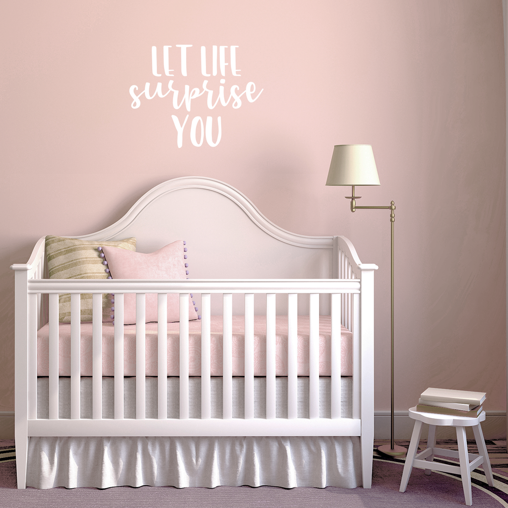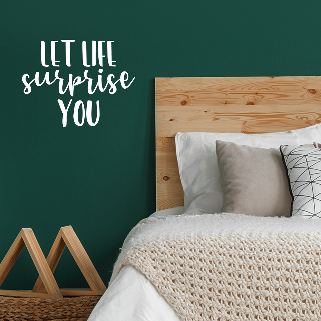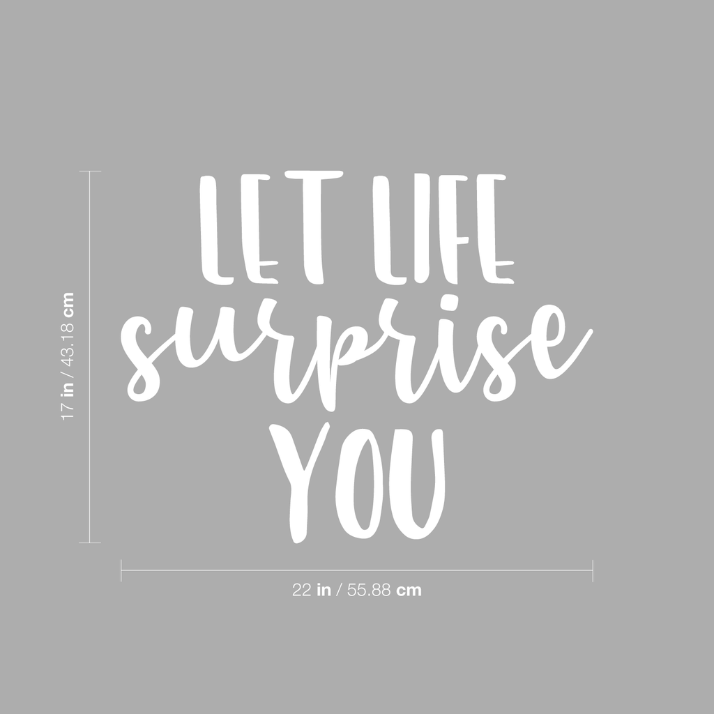 This awesome decal quote "Let Life Surprise You"; is the perfect touch for your home or workplace. Use it for your dorm room; home office; classroom or anywhere you want to bring some extra decoration. It's a vinyl sticker that is easy to put on any smooth and dry surface. Our modern designs don't just brighten up the room; but brighten up the day. Using top of the line vinyl across all of our production allows us to be the leaders in quality and design.