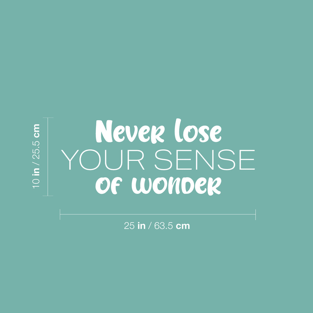 This awesome positive & fun decal quote "Never Lose Your Sense Of Wonder" is the perfect touch for your home or school. Use it for your bedroom; playroom; kids room or anywhere you want to bring some extra cute decoration. It's a vinyl sticker that is easy to put on any smooth and dry surface. Our modern designs don't just brighten up the room; but brighten up the day. Using top of the line vinyl across all of our production allows us to be the leaders in quality and design.