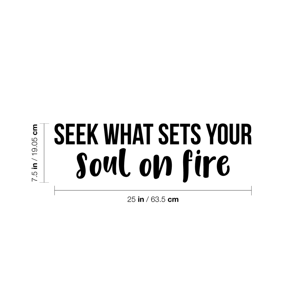 This awesome inspirational decal quote "Seek What Sets Your Soul On Fire"; is the perfect touch for your home or work. Use it for your bedroom; home office; dorm room or anywhere you want to bring some extra positive decoration. It's a vinyl sticker that is easy to put on any smooth and dry surface. Our modern designs don't just brighten up the room; but brighten up the day. Using top of the line vinyl across all of our production allows us to be the leaders in quality and design.