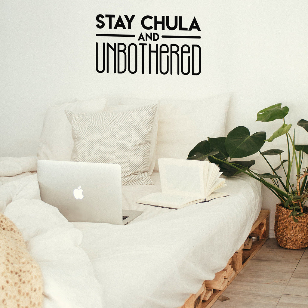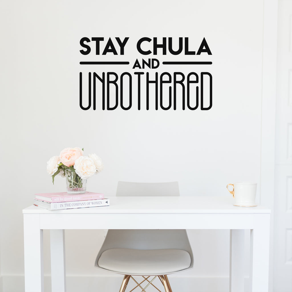 This awesome decal quote "Stay Chula And Unbothered"; is the perfect touch for your home or apartment. Use it for your dorm room; closet or anywhere you want to bring some extra decoration. It's a vinyl sticker that is easy to put on any smooth and dry surface. Our modern designs don't just brighten up the room; but brighten up the day. Using top of the line vinyl across all of our production allows us to be the leaders in quality and design.