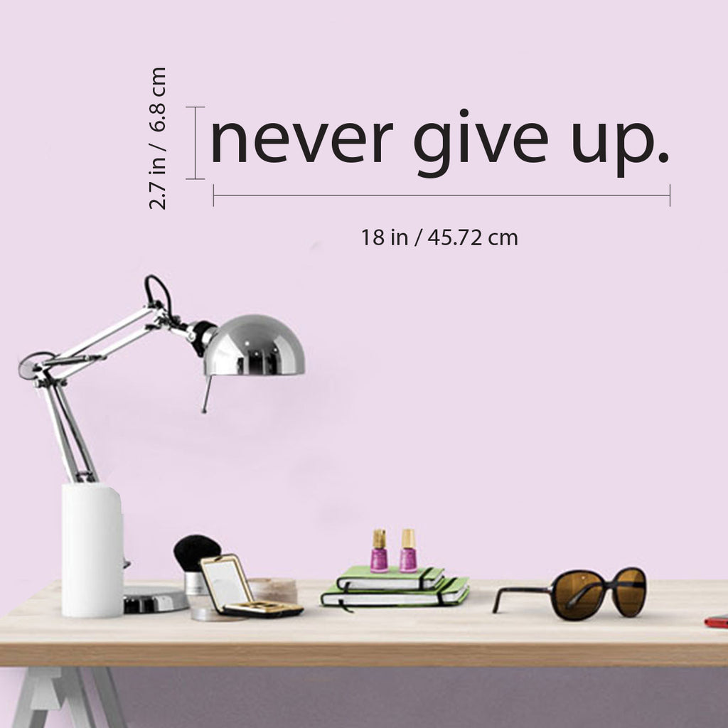 This awesome optimistic decal quote "Never Give Up"; is the perfect touch for your home or work. Use it for your bedroom; closet; living room or anywhere you want to bring some extra positive decoration. It's a vinyl sticker that is easy to put on any smooth and dry surface. Our modern designs don't just brighten up the room; but brighten up the day. Using top of the line vinyl across all of our production allows us to be the leaders in quality and design.