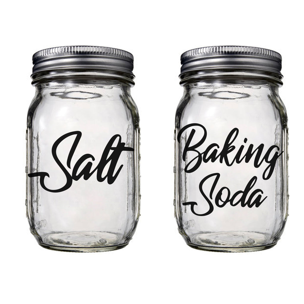 Set of 2 Vinyl Art Decals - Salt And Baking Soda - From Each - Modern Label Quote Stickers For Family Home Kitchen Containers Pantry Names Glass Spice Jars Decor