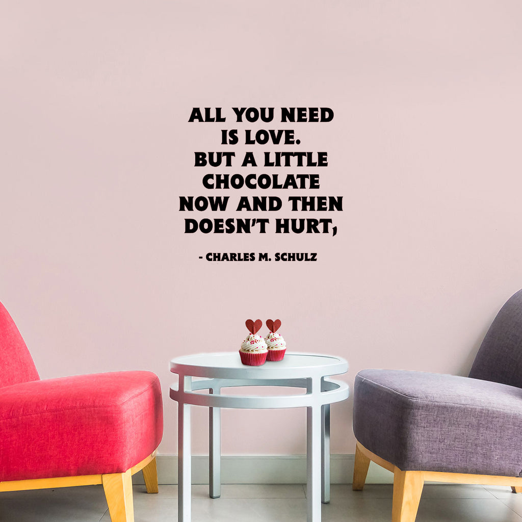 This motivational "All You Need Is Love But A Little Chocolate Now And Then Doesn’t Hurt - Charles Schulz" life quotes wall art decal is modern and the perfect touch for both indoor and outdoor decoration. It’s a vinyl sticker that is easy to put on almost any smooth surface and really brings a room together adding the perfect touch of decoration. This vinyl decal quote is perfect for women to remember that it’s important to be happy and look for the positivity in life. Our modern quotes don’t just brighten up the room; but brighten up the day. Using top of the line vinyl across all of our production allows us to be the leaders in quality and design.The easiest surfaces for Vinyl to stick on is Windows Walls Mirrors Dorm Rooms Cars Lockers Flat and Smooth Surfaces Tables and Glass CabinetsAll vinyl packages come with easy to follow instructions further explaining just how simple it is to apply vinyl on and off your surface of choice. Prior to applying the vinyl; be sure the surface is clean and oil free for best results. This vinyl is waterproof and is not permanent so it’s not only easy to use but easy to remove as well. In general; vinyl lettering is one of the latest and greatest trends in home decoration. Because our products are high quality; they give the illusion of painted wall art without the mess; cost; or time. What are you waiting for? Let’s get crafty!