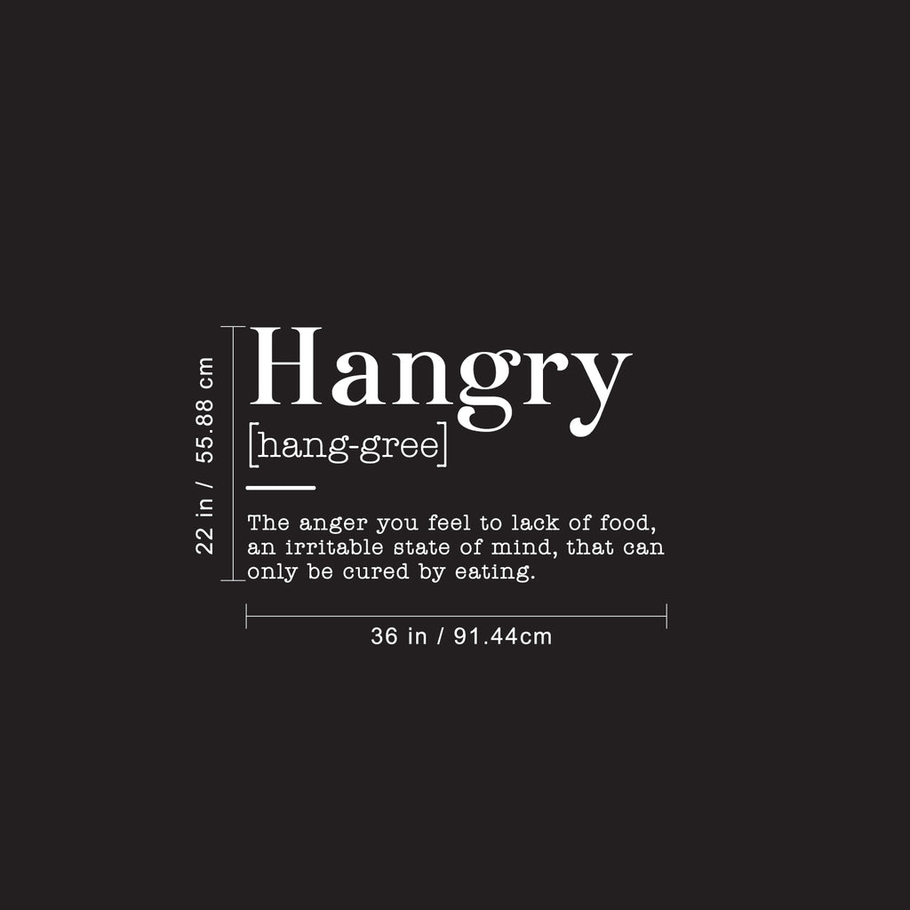 This "Hangry The Anger You Feel To Lack Of Food; An Irritable State Of Mind; That Can Only Be Cured By Eating" quote wall art decal is funny and the perfect touch for both indoor and outdoor decoration. It is a vinyl sticker that is easy to put onto almost any smooth surface and really brings a room together adding the perfect amount of decoration. This vinyl decal quote is modern and perfect to put in the kitchen; dining room; or in an eatery to add funny joke to brighten up someone's day. Our modern quotes don't just brighten up the room; but brighten up the day. Using top of the line vinyl across all of our production allows us to be the leaders in quality and design.
