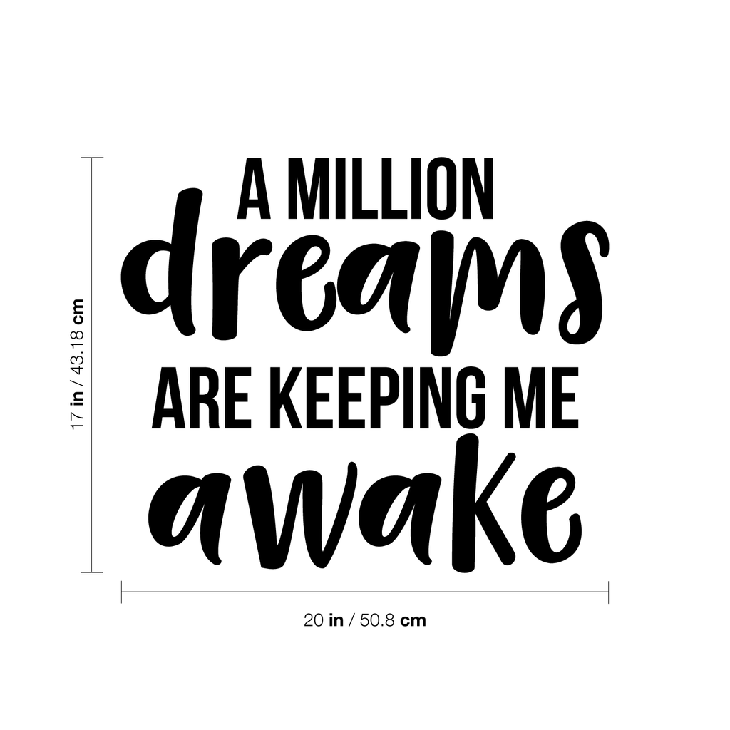 This awesome inspirational decal quote "A Million Dreams Are Keeping Me Awake"; is the perfect touch for your home or coffee shop. Use it for your bedroom; kids room; home office or anywhere you want to bring some extra decoration. It's a vinyl sticker that is easy to put on any smooth and dry surface. Our modern designs don't just brighten up the room; but brighten up the day. Using top of the line vinyl across all of our production allows us to be the leaders in quality and design.