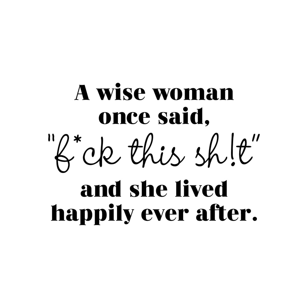 This awesome decal quote "A Wise Woman Once Said Fck This Sh!t And She Lived Happily Ever After"; is the perfect touch for your home or apartment. Use it for your dorm room; home office or anywhere you want to bring some extra decoration. It's a vinyl sticker that is easy to put on any smooth and dry surface. Our modern designs don't just brighten up the room; but brighten up the day. Using top of the line vinyl across all of our production allows us to be the leaders in quality and design.