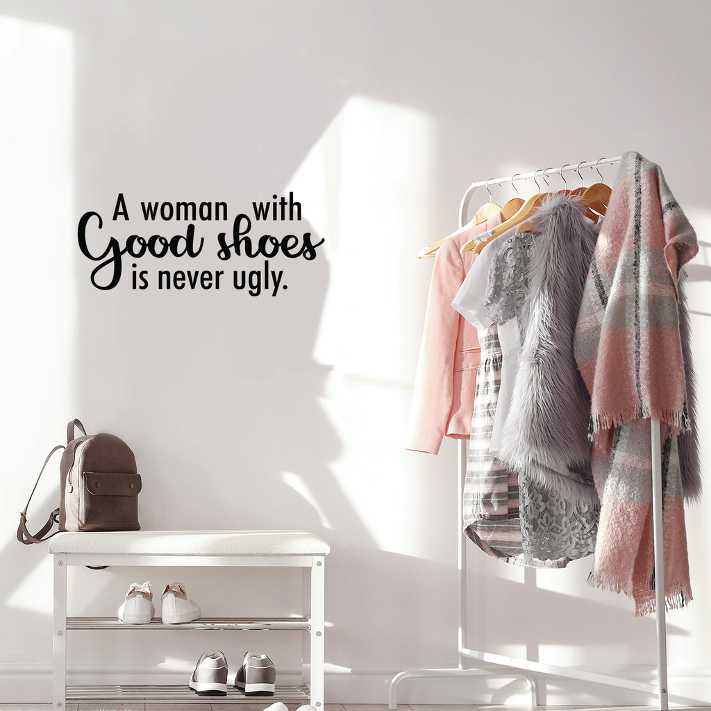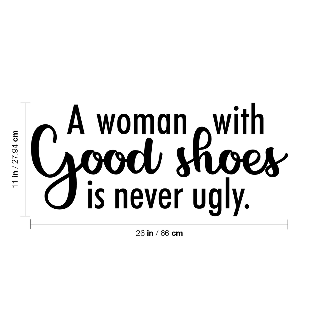 This awesome cute & inspiring decal quote "A Woman With Good Shoes Is Never Ugly"; is the perfect touch for your home or office. Use it for your make up mirror; bathroom; closet or anywhere you want to bring some extra positive decoration. It's a vinyl sticker that is easy to put on any smooth and dry surface. Our modern designs don't just brighten up the room; but brighten up the day. Using top of the line vinyl across all of our production allows us to be the leaders in quality and design.
