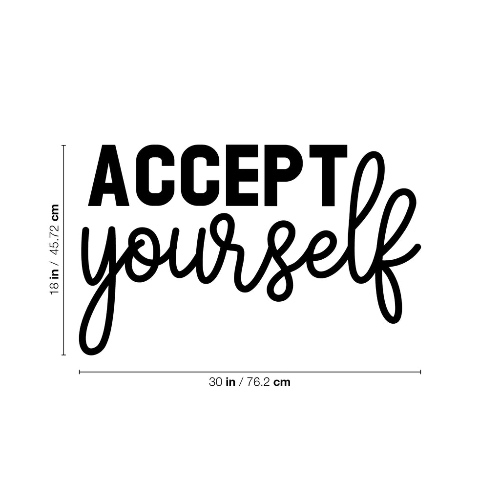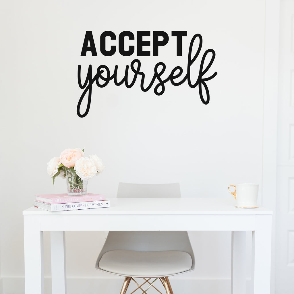 This cute decal quote "Accept Yourself"; is the perfect touch for your home or work. Use it for your dorm room; home office or anywhere you want to bring some extra decoration. It's a vinyl sticker that is easy to put on any smooth and dry surface. Our modern designs don't just brighten up the room; but brighten up the day. Using top of the line vinyl across all of our production allows us to be the leaders in quality and design.