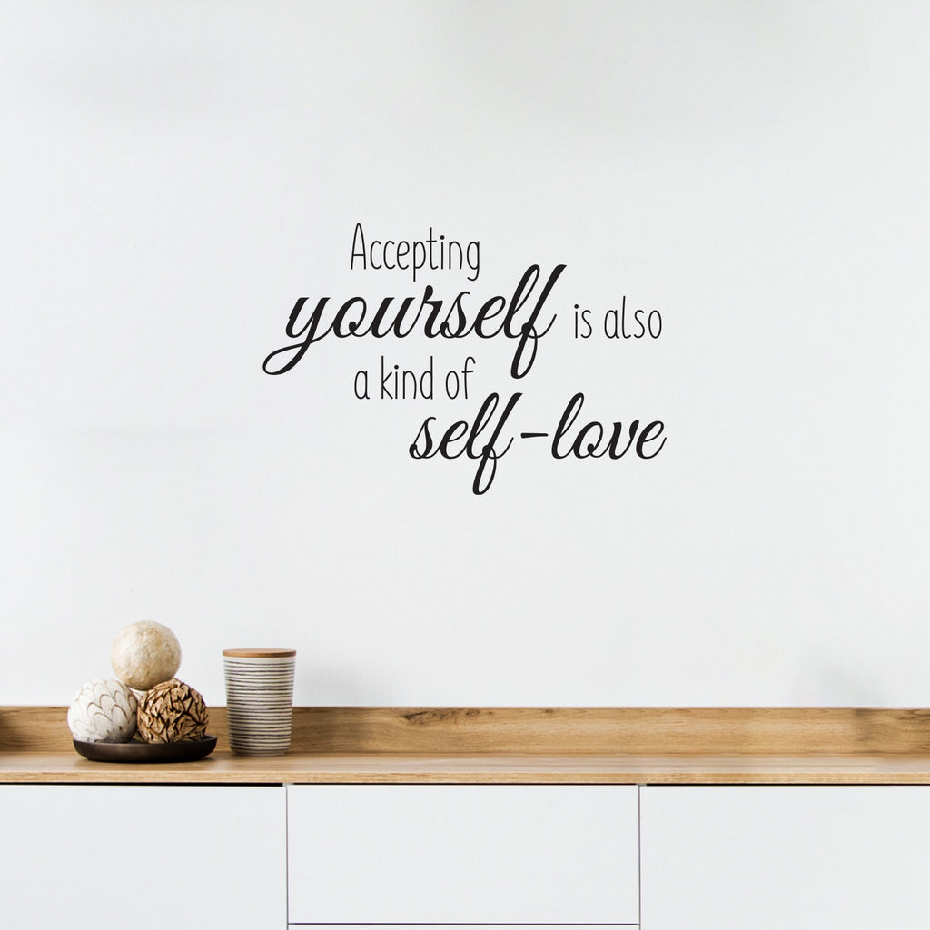 This awesome positive decal quote "Accepting Yourself"; is the perfect touch for your home or office. Use it for your bedroom; closet; classroom or anywhere you want to bring some extra positive decoration. It's a vinyl sticker that is easy to put on any smooth and dry surface. Our modern designs don't just brighten up the room; but brighten up the day. Using top of the line vinyl across all of our production allows us to be the leaders in quality and design.