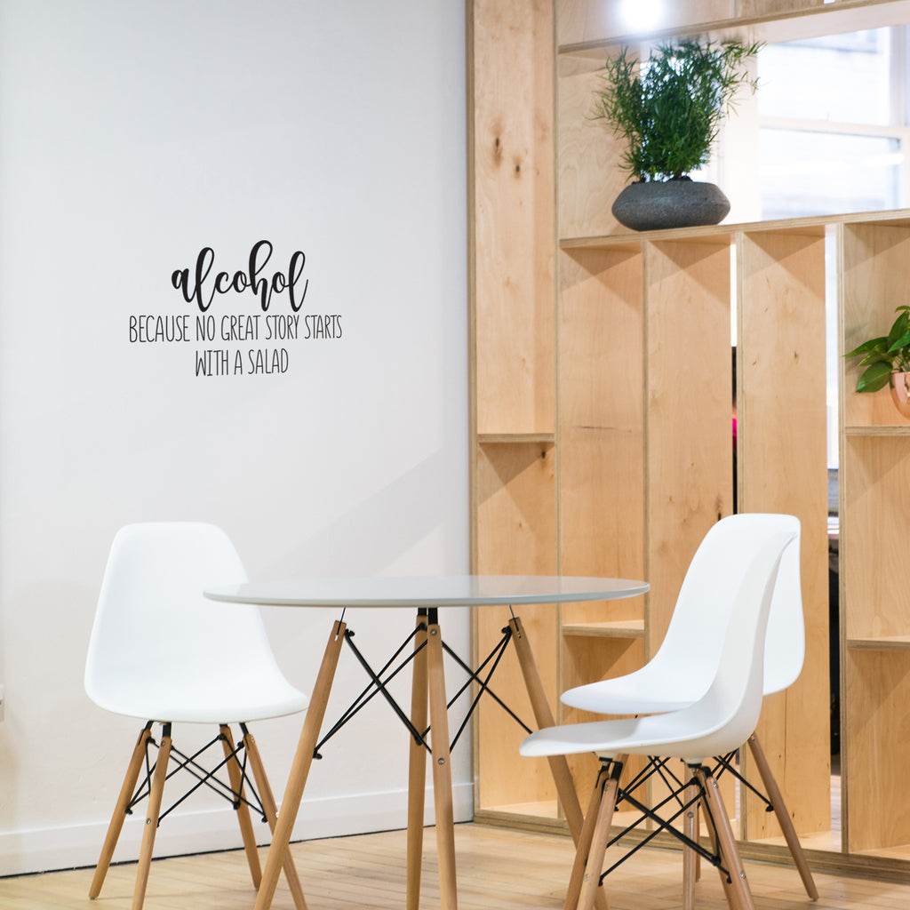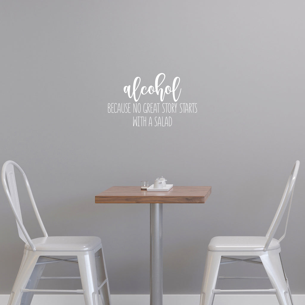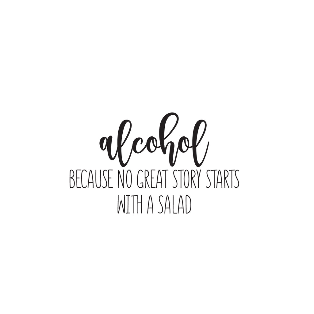 This awesome funny decal quote "Alcohol Because No Great Story Starts With A Salad"; is the perfect touch for your home or storefront. Use it for your living room; kitchen; coffee shop or anywhere you want to bring some extra cute decoration. It's a vinyl sticker that is easy to put on any smooth and dry surface. Our modern designs don't just brighten up the room; but brighten up the day. Using top of the line vinyl across all of our production allows us to be the leaders in quality and design.