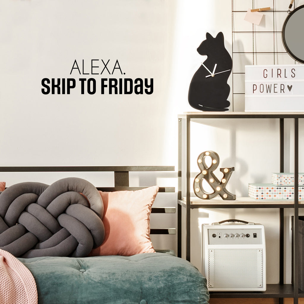 This awesome fun & positive decal quote "Alexa; Skip To Friday"; is the perfect touch for your home. Use it for your bathroom; laundry room; washing space or anywhere you want to bring some extra positive decoration. It's a vinyl sticker that is easy to put on any smooth and dry surface. Our modern designs don't just brighten up the room; but brighten up the day. Using top of the line vinyl across all of our production allows us to be the leaders in quality and design.