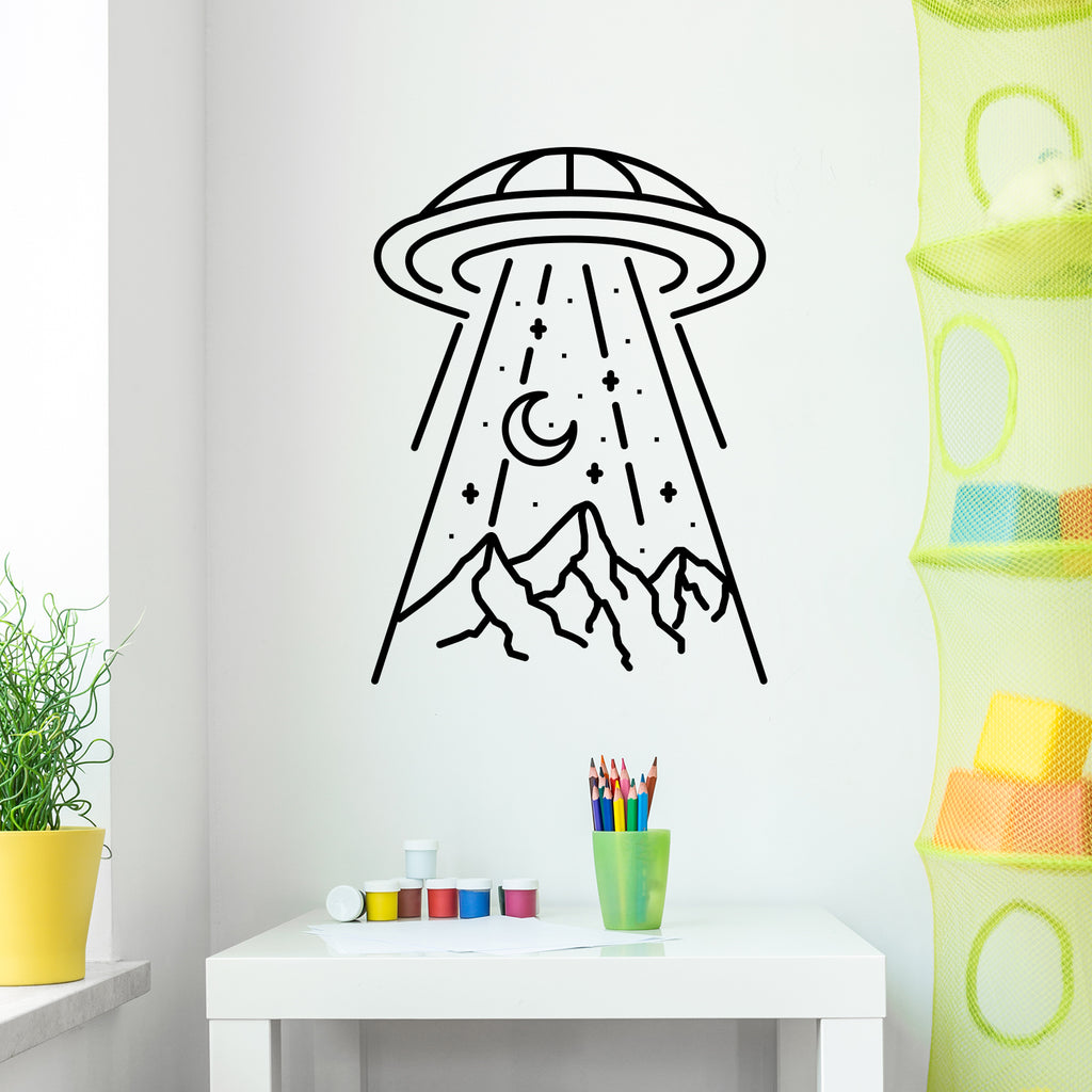 This decal quote "Alien Abduction" is the perfect touch for your home. Use it for your nursery; playroom; kids room or anywhere you want to bring some extra positive decoration. It's a vinyl sticker that is easy to put on any smooth and dry surface. Our modern designs don't just brighten up the room; but brighten up the day. Using top of the line vinyl across all of our production allows us to be the leaders in quality and design.