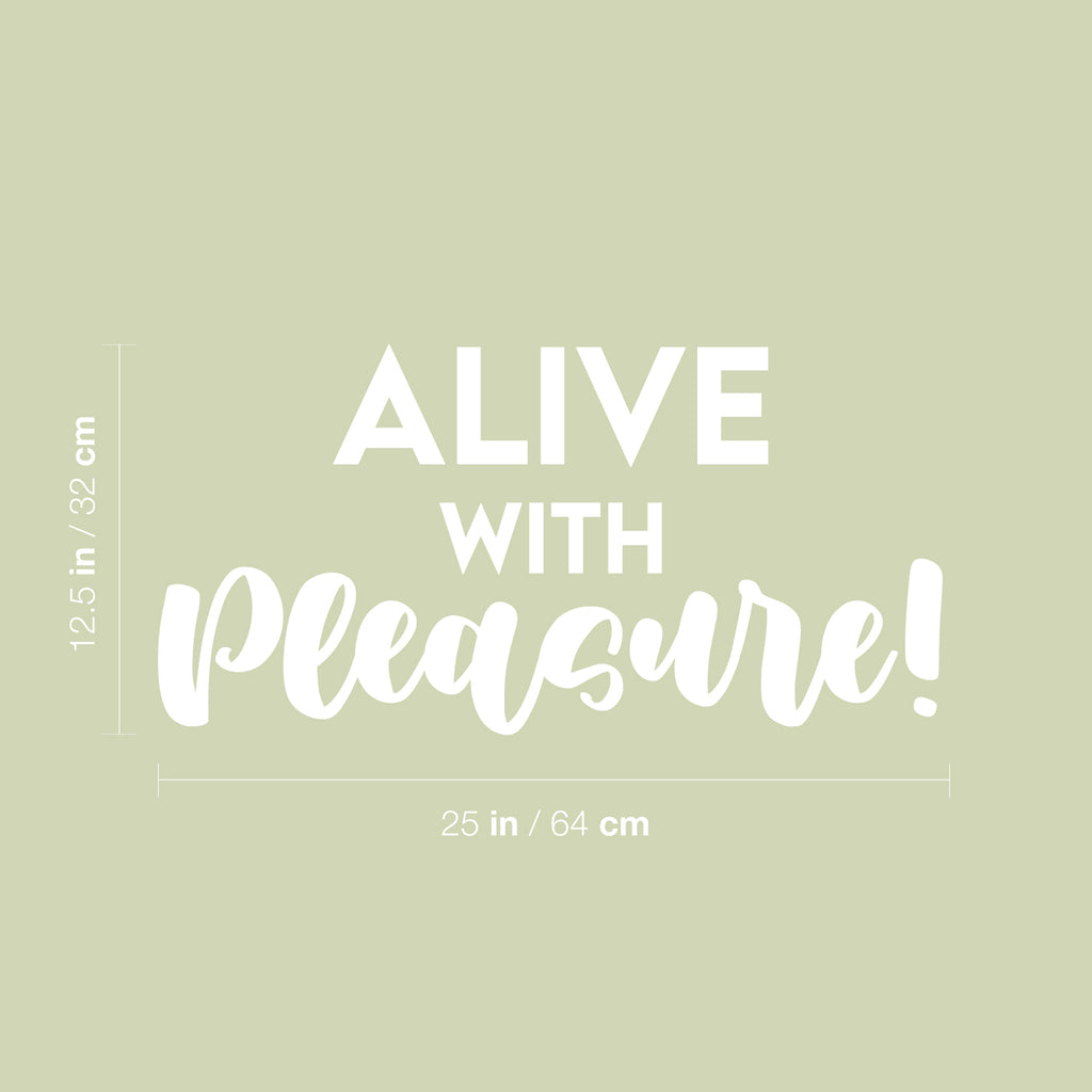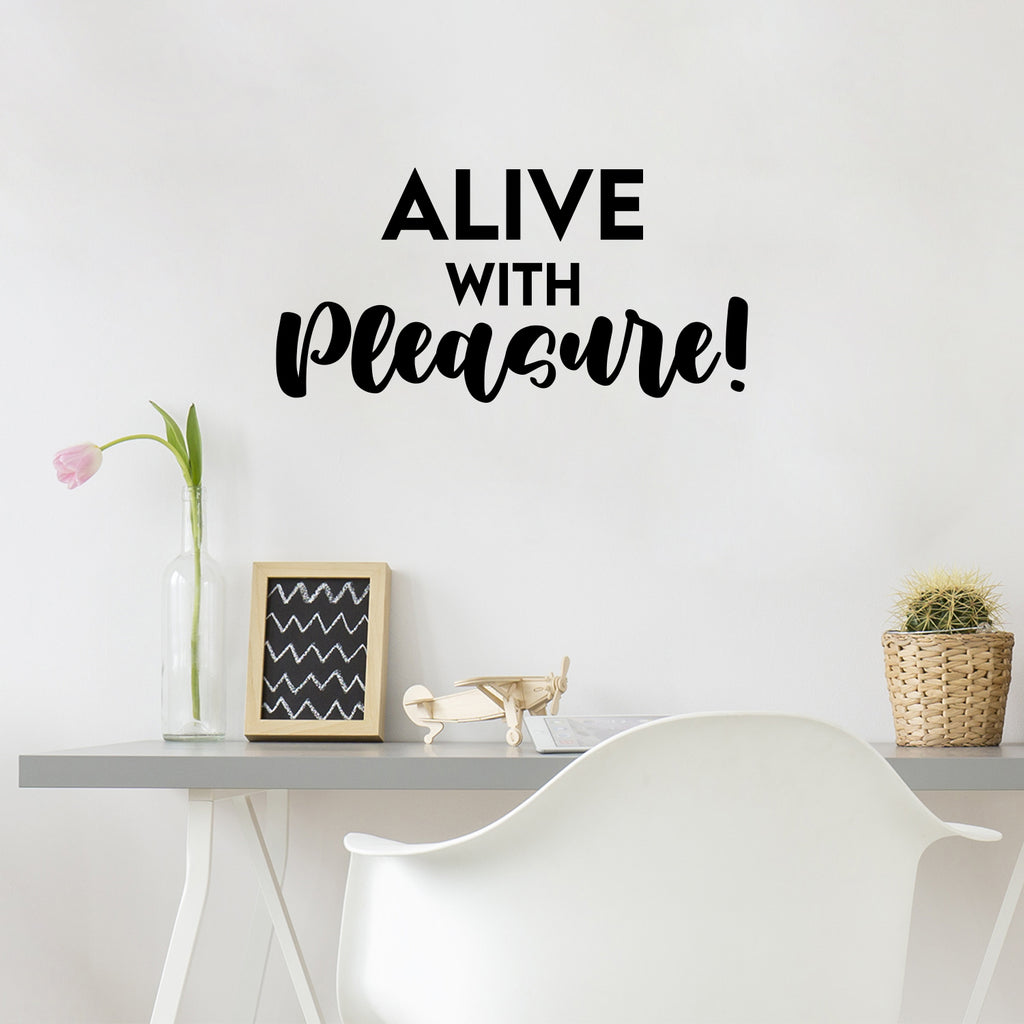 This awesome motivational decal quote "Alive With Pleasure!"; is the perfect touch for your home or school. Use it for your living room; playroom; kids room or anywhere you want to bring some extra cute decoration. It's a vinyl sticker that is easy to put on any smooth and dry surface. Our modern designs don't just brighten up the room; but brighten up the day. Using top of the line vinyl across all of our production allows us to be the leaders in quality and design.