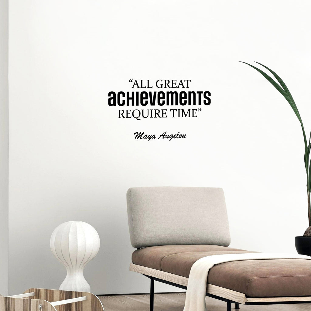 This awesome positive & motivating decal quote "All Great Achievements Require Time"; is the perfect touch for your office or gym. Use it for your living room; classroom; storefront or anywhere you want to bring some extra positive decoration. It's a vinyl sticker that is easy to put on any smooth and dry surface. Our modern designs don't just brighten up the room; but brighten up the day. Using top of the line vinyl across all of our production allows us to be the leaders in quality and design.