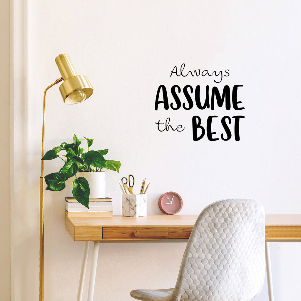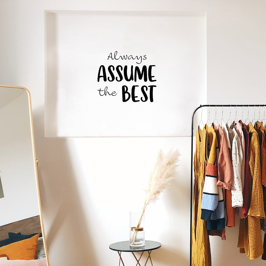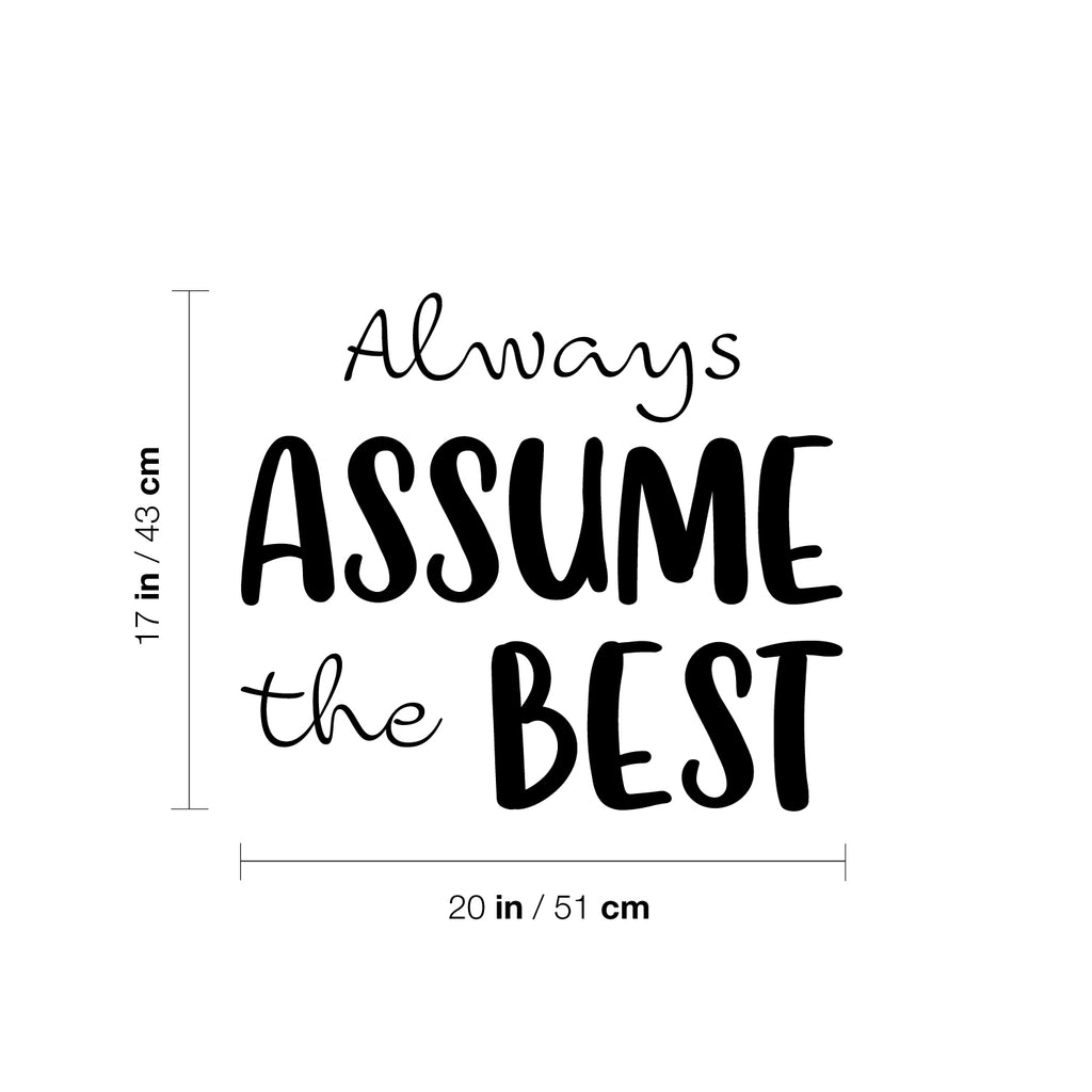 This awesome motivational & positive decal quote "Always Assume The Best"; is the perfect touch for your home or office. Use it for your bedroom; living room; classroom or anywhere you want to bring some extra positive decoration. It's a vinyl sticker that is easy to put on any smooth and dry surface. Our modern designs don't just brighten up the room; but brighten up the day. Using top of the line vinyl across all of our production allows us to be the leaders in quality and design.