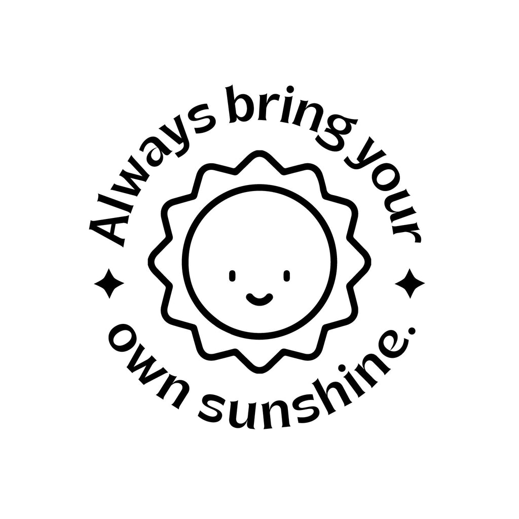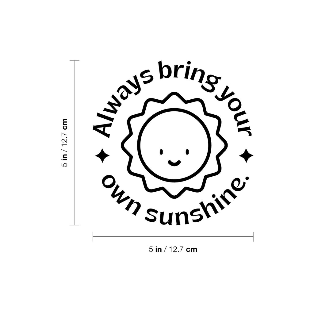 This cute decal quote "Always Bring Your Own Sunshine "; is the perfect touch for your home or office. Use it for your home or anywhere you want to bring some extra fun decoration. It's a vinyl sticker that is easy to put on any smooth and dry surface. Our modern designs don't just brighten up the room; but brighten up the day. Using top of the line vinyl across all of our production allows us to be the leaders in quality and design.