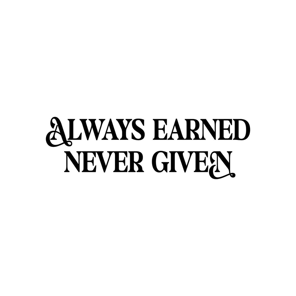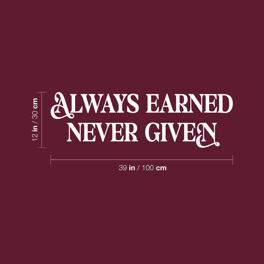 This awesome motivational decal quote "Always Earned Never Given"; is the perfect touch for your home or office. Use it for your study room; classroom; coffee shop or anywhere you want to bring some extra positive decoration. It's a vinyl sticker that is easy to put on any smooth and dry surface. Our modern designs don't just brighten up the room; but brighten up the day. Using top of the line vinyl across all of our production allows us to be the leaders in quality and design.