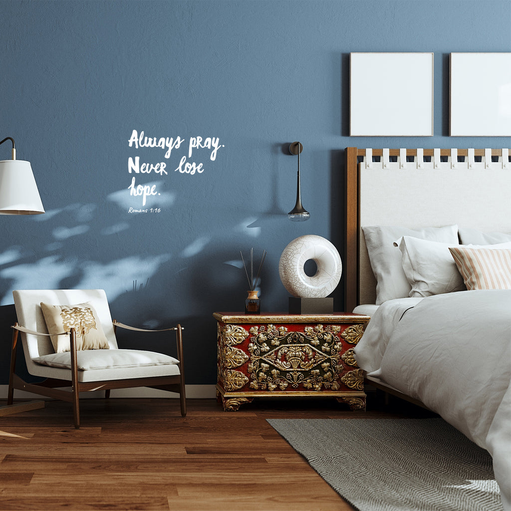 This awesome spiritual & inspiring decal quote "Always Pray - Romans 1:16"; is the perfect touch for your home. Use it for your office; living room or anywhere you want to bring some extra cute decoration. It's a vinyl sticker that is easy to put on any smooth and dry surface. Our modern designs don't just brighten up the room; but brighten up the day. Using top of the line vinyl across all of our production allows us to be the leaders in quality and design.