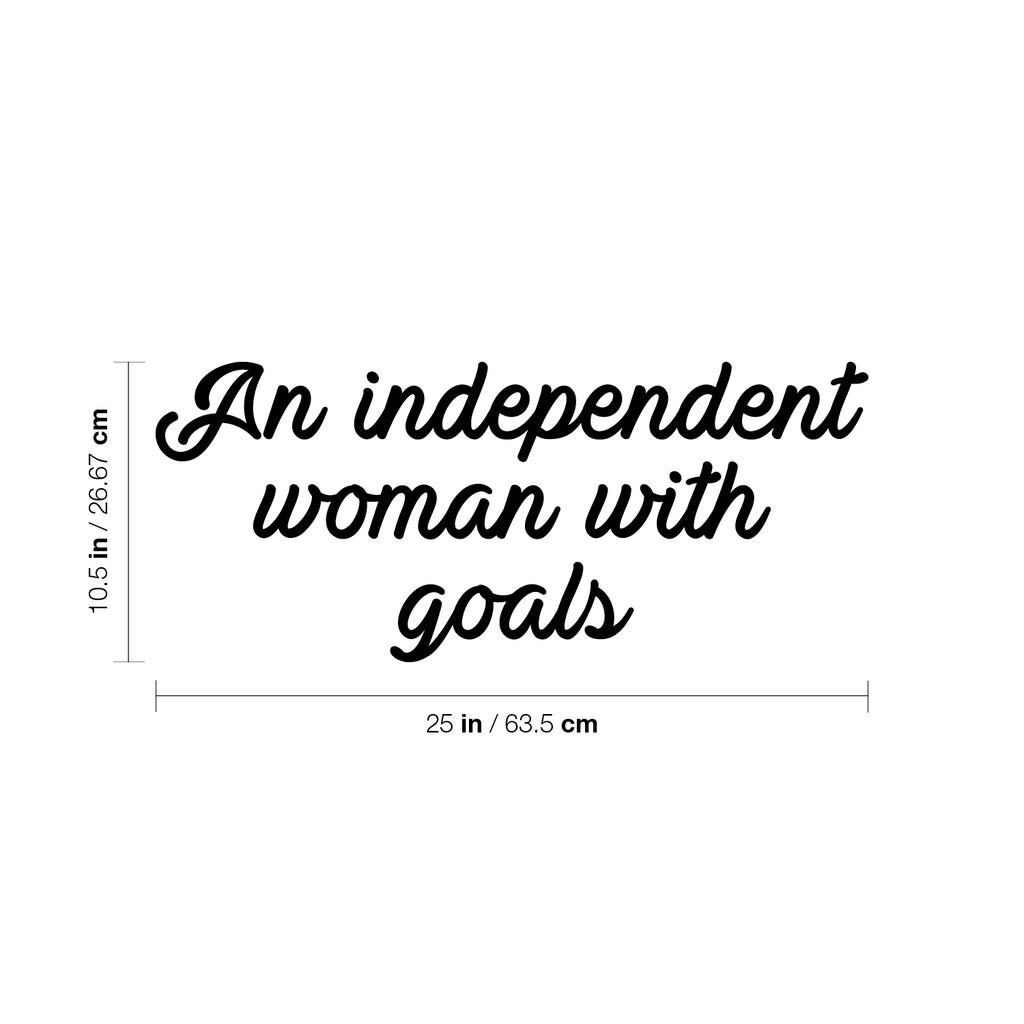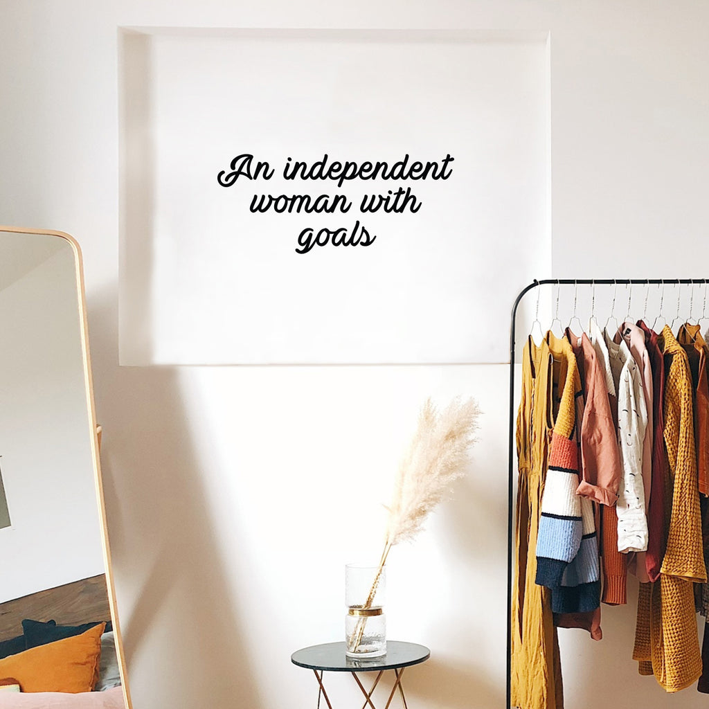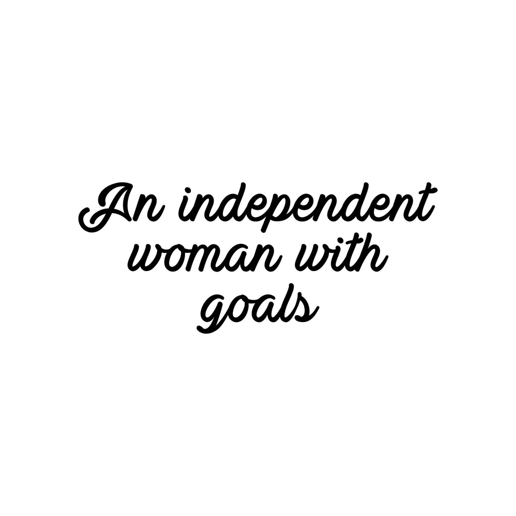 This empowering decal quote "An Independent Woman With Goals"; is the perfect touch for your home or work. Use it for your dorm room; home office or anywhere you want to bring some extra decoration. It's a vinyl sticker that is easy to put on any smooth and dry surface. Our modern designs don't just brighten up the room; but brighten up the day. Using top of the line vinyl across all of our production allows us to be the leaders in quality and design.