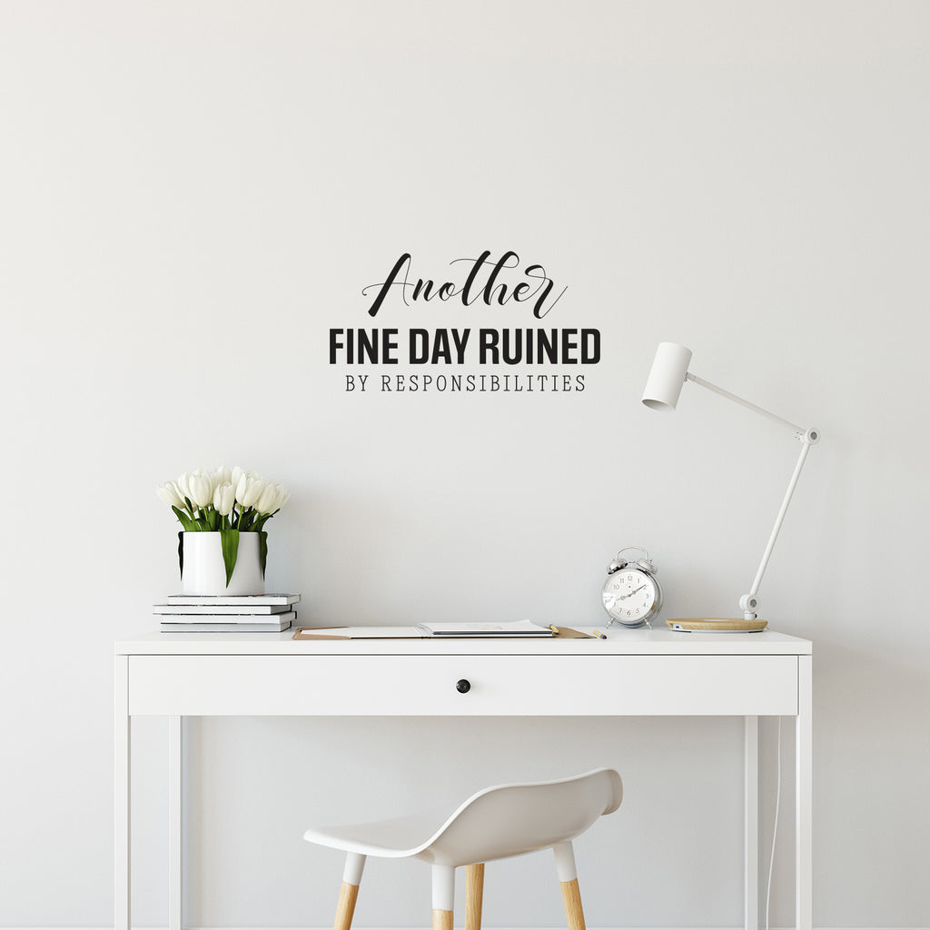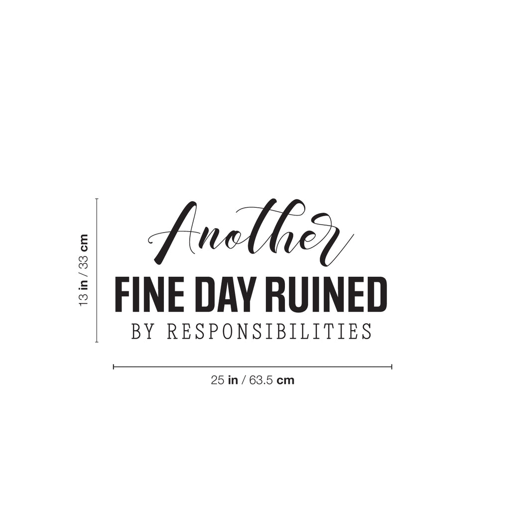 This awesome funny & sarcastic decal quote "Another Fine Day Ruined By Responsibilities"; is the perfect touch for your home or office. Use it for your store; coffee shop or anywhere you want to bring some extra fun decoration. It's a vinyl sticker that is easy to put on any smooth and dry surface. Our modern designs don't just brighten up the room; but brighten up the day. Using top of the line vinyl across all of our production allows us to be the leaders in quality and design.