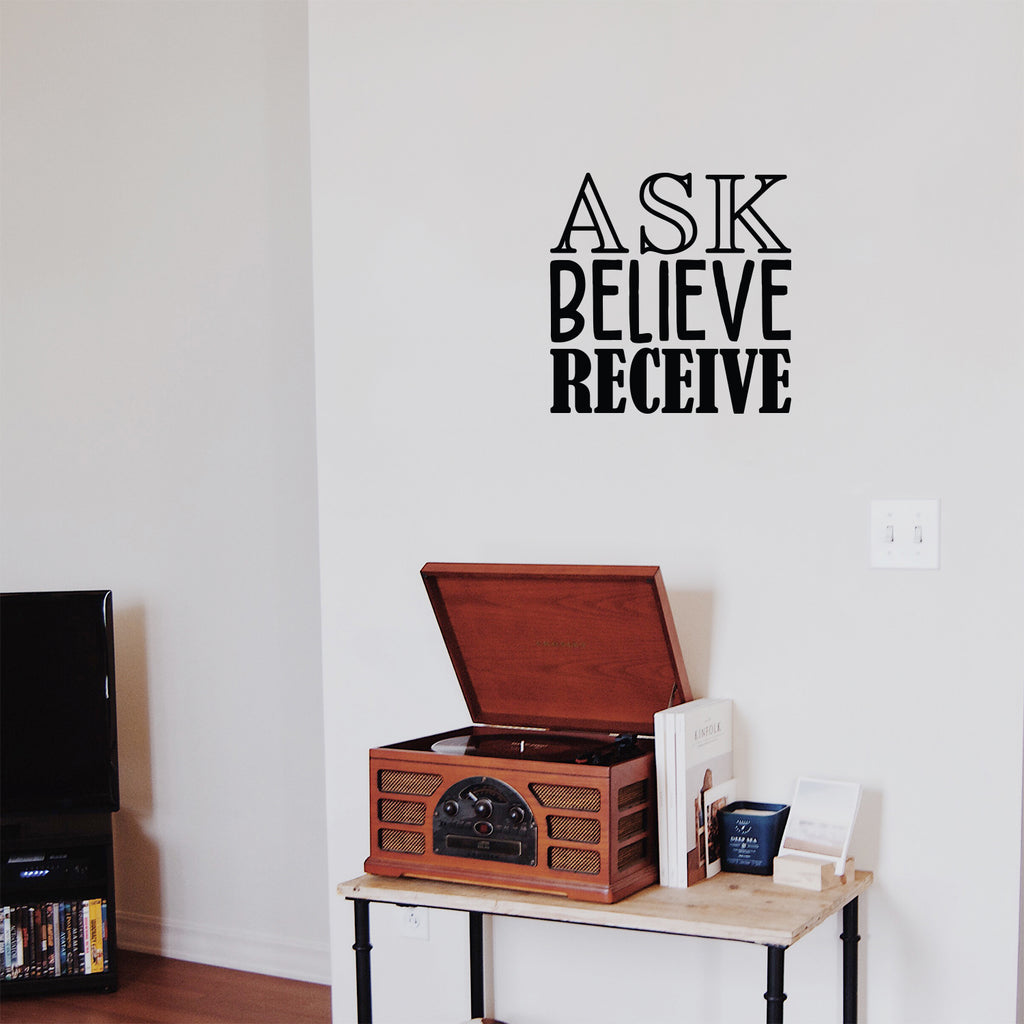 This awesome positive decal quote "Ask Believe Receive"; is the perfect touch for your home or office. Use it for your bedroom; playroom; living room or anywhere you want to bring some extra positive decoration. It's a vinyl sticker that is easy to put on any smooth and dry surface. Our modern designs don't just brighten up the room; but brighten up the day. Using top of the line vinyl across all of our production allows us to be the leaders in quality and design.