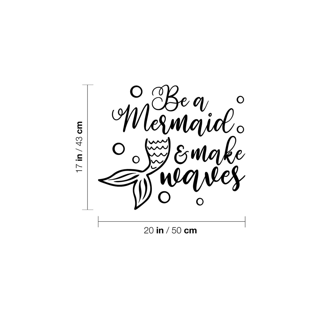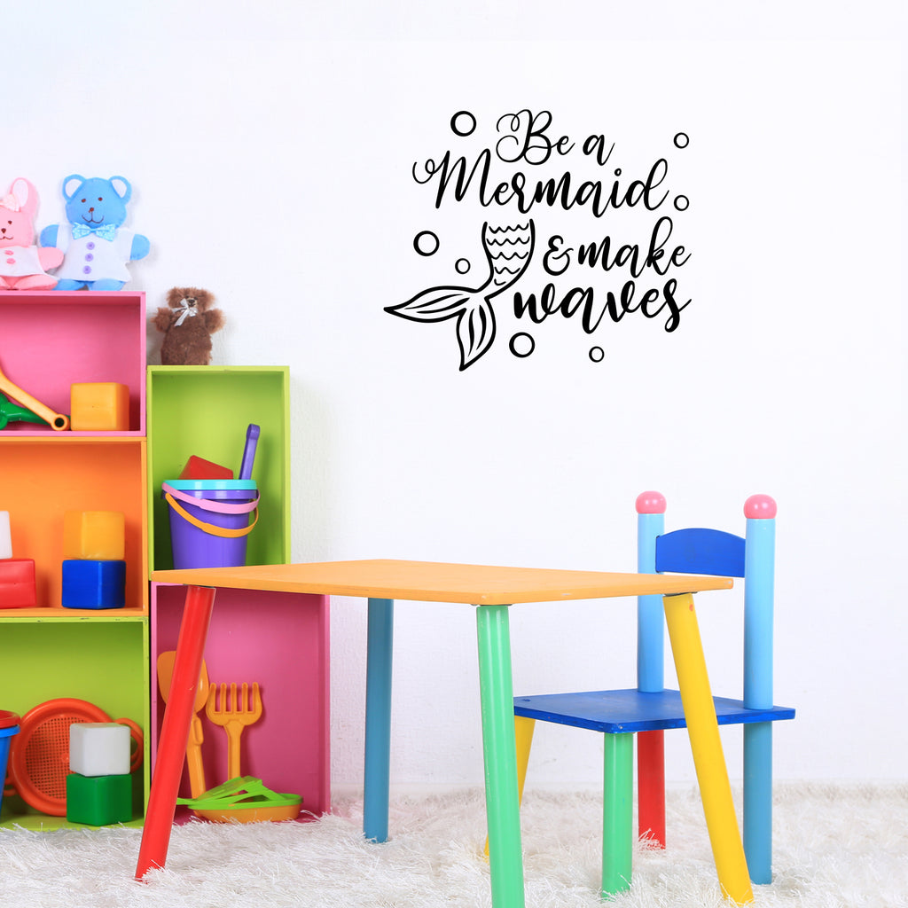 This cute decal quote "Be A Mermaid And Make Waves" is the perfect touch for your home. Use it for your nursery; playroom; kids room or anywhere you want to bring some extra cute decoration. It's a vinyl sticker that is easy to put on any smooth and dry surface. Our modern designs don't just brighten up the room; but brighten up the day. Using top of the line vinyl across all of our production allows us to be the leaders in quality and design.