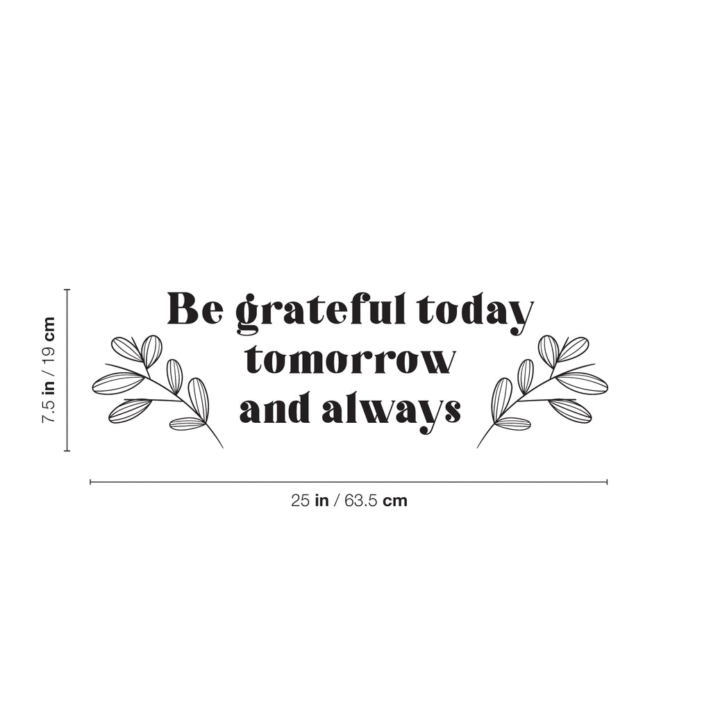 This awesome motivational decal quote "Be Grateful Today Tomorrow And Always"; is the perfect touch for your home or office. Use it for your dorm room; home office; living room or anywhere you want to bring some extra cute decoration. It's a vinyl sticker that is easy to put on any smooth and dry surface. Our modern designs don't just brighten up the room; but brighten up the day. Using top of the line vinyl across all of our production allows us to be the leaders in quality and design.