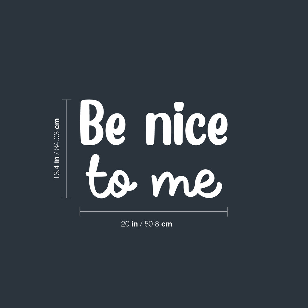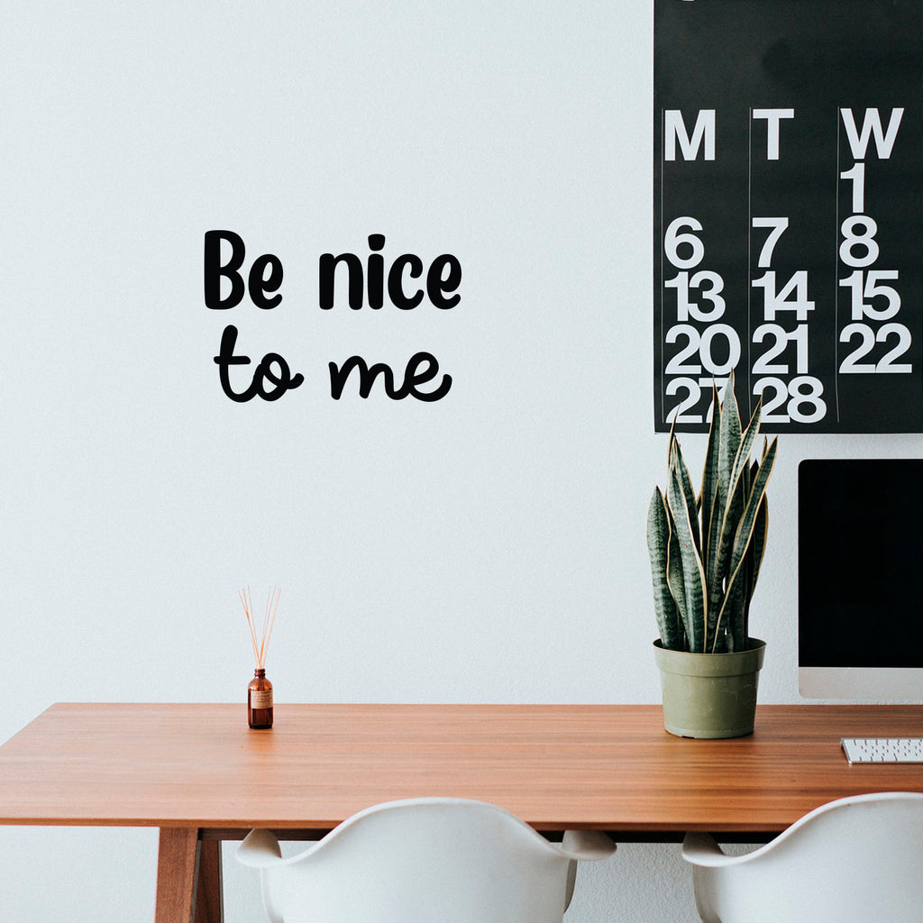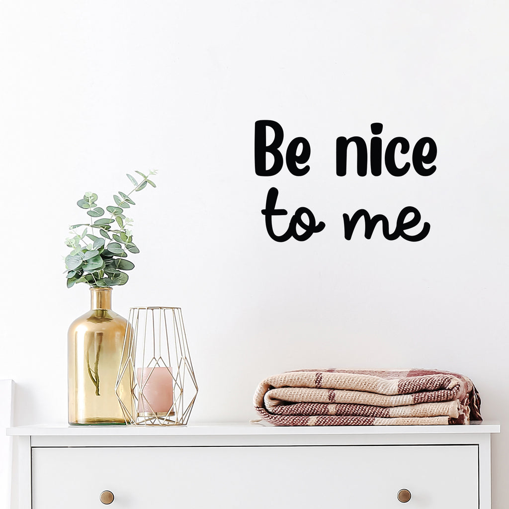 This awesome motivational & positive decal quote "Be Nice To Me"; is the perfect touch for your home or office. Use it for your bedroom; closet; classroom or anywhere you want to bring some extra positive decoration. It's a vinyl sticker that is easy to put on any smooth and dry surface. Our modern designs don't just brighten up the room; but brighten up the day. Using top of the line vinyl across all of our production allows us to be the leaders in quality and design.