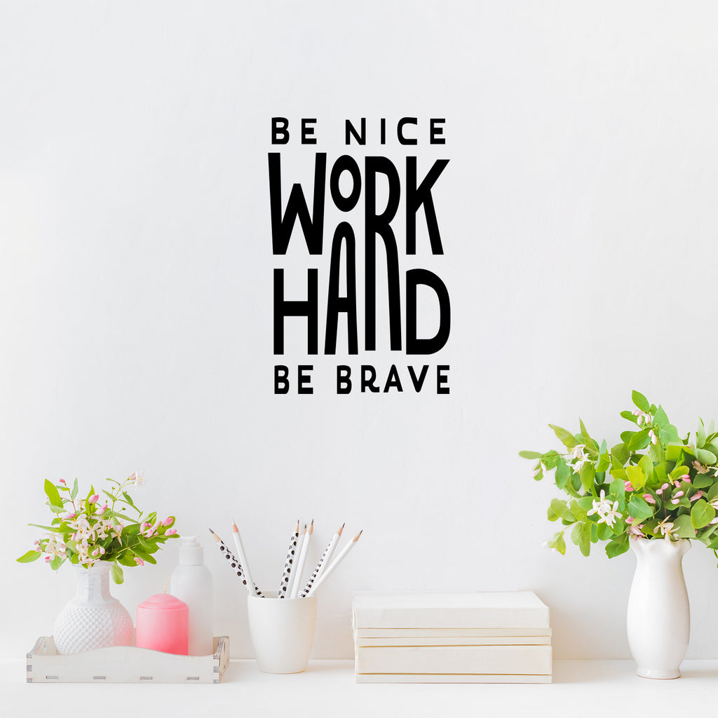 This modern motivational decal quote "Be Nice Work Hard Be Brave"; is the perfect touch for your office or classroom. Use it for your living room; school; coffee shop or anywhere you want to bring some extra positive decoration. It's a vinyl sticker that is easy to put on any smooth and dry surface. Our modern designs don't just brighten up the room; but brighten up the day. Using top of the line vinyl across all of our production allows us to be the leaders in quality and design.