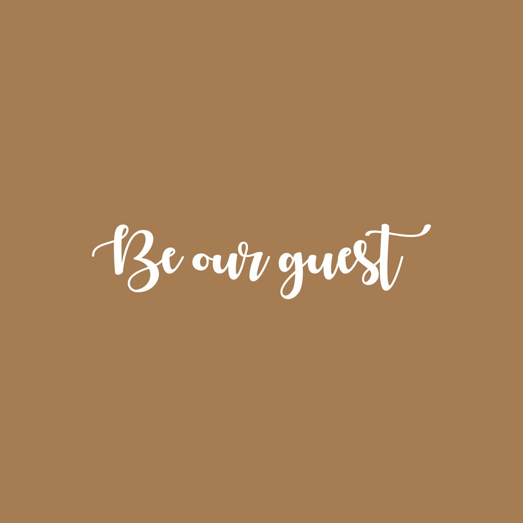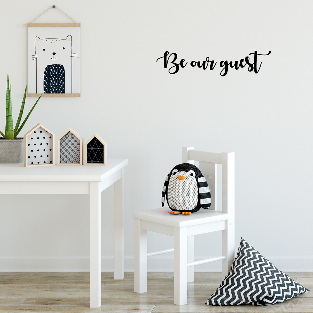 This inspirational & cute decal quote "Be Our Guest"; is the perfect touch for your home or school. Use it for your living room; playroom; kids room or anywhere you want to bring some extra cute decoration. It's a vinyl sticker that is easy to put on any smooth and dry surface. Our modern designs don't just brighten up the room; but brighten up the day. Using top of the line vinyl across all of our production allows us to be the leaders in quality and design.